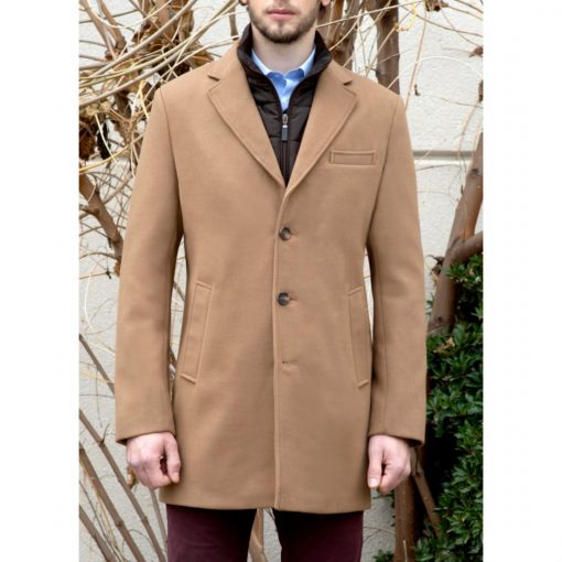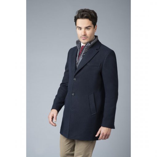 Abrigo de paño con pecherín desmontable. Disponible en azul marino y camel.