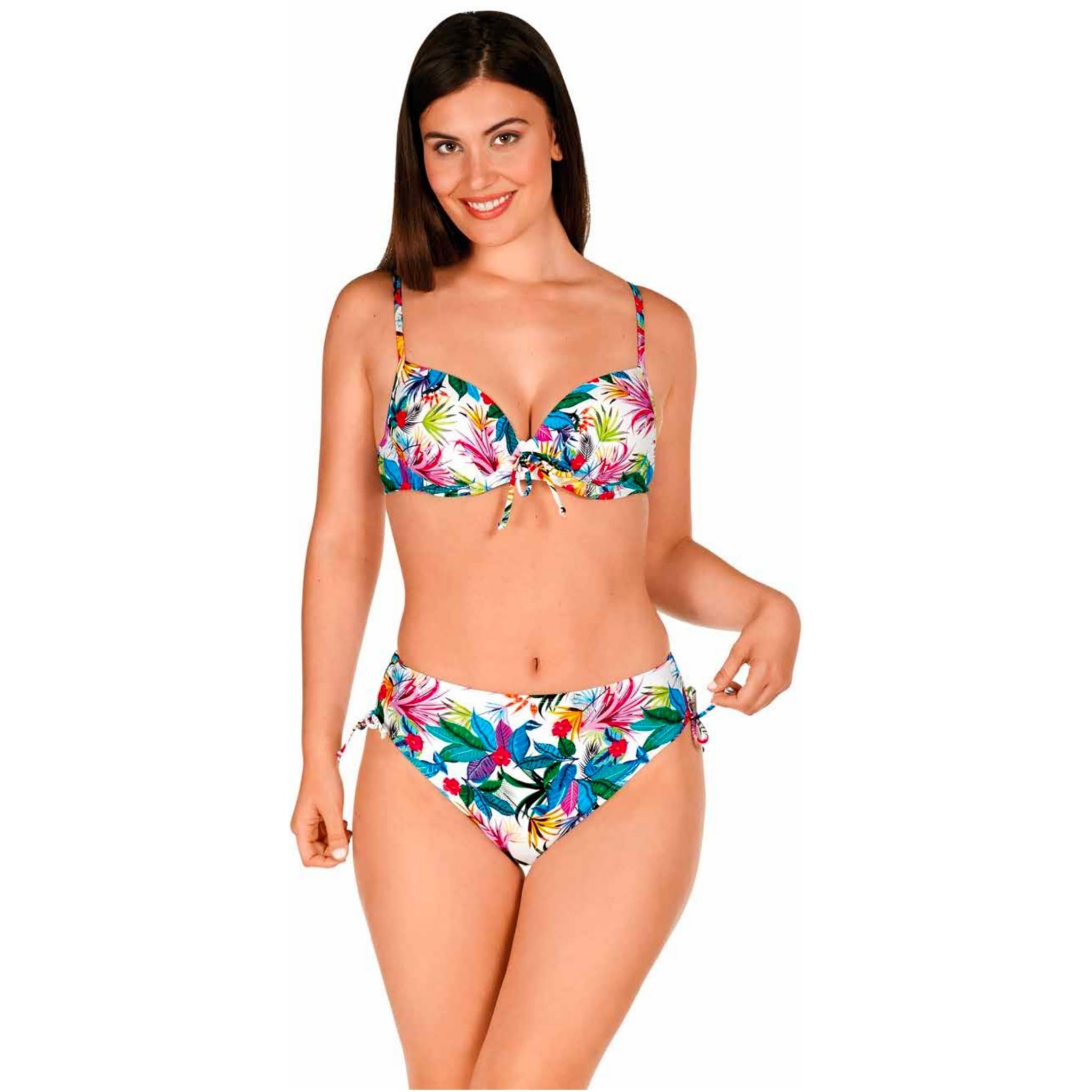 bikini compuesto por parte de arriba con cascos, aros y tirantes regulables, lazo decorativo en el pecho. Braga de talle alto, a juego con lazada regulable en los laterales. Se hace desde la talla 38 hasta la 52.