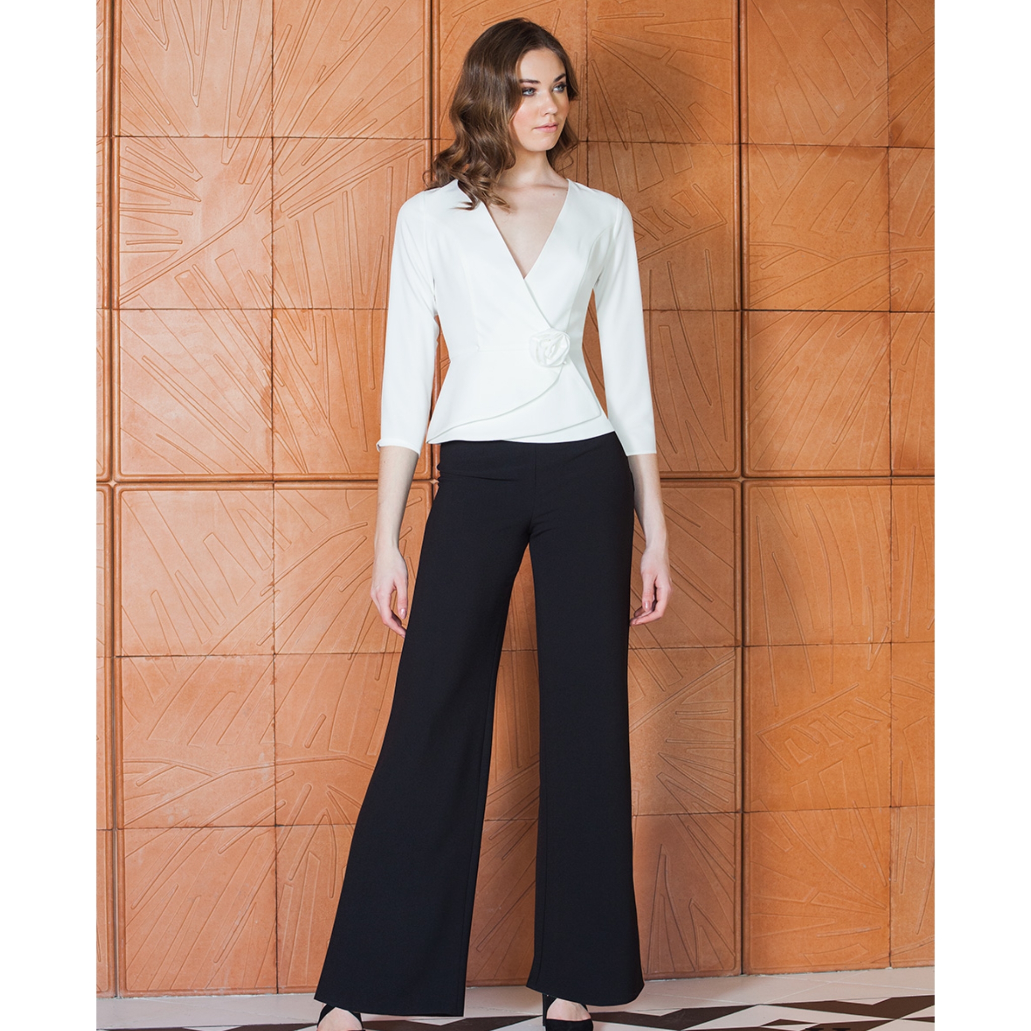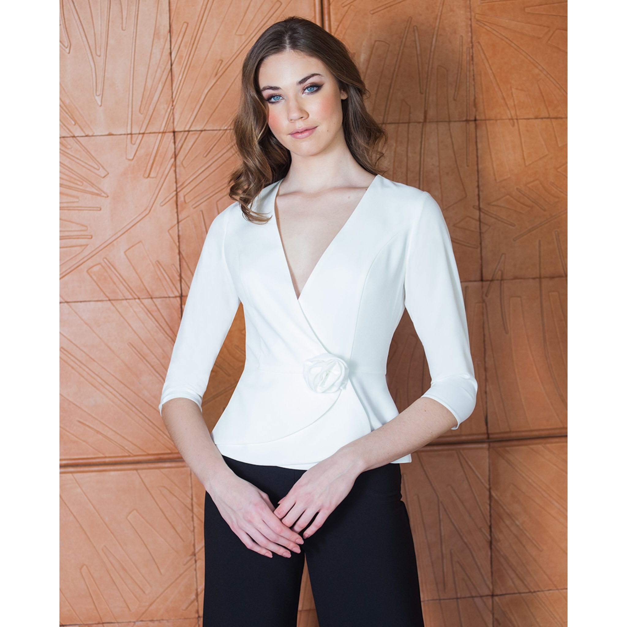 Blusa cruzada, con cierre de clic lateral, adorno floral en la cintura y mangas 3/4. Se hace desde la talla 38 hasta la 52, en color marfil.