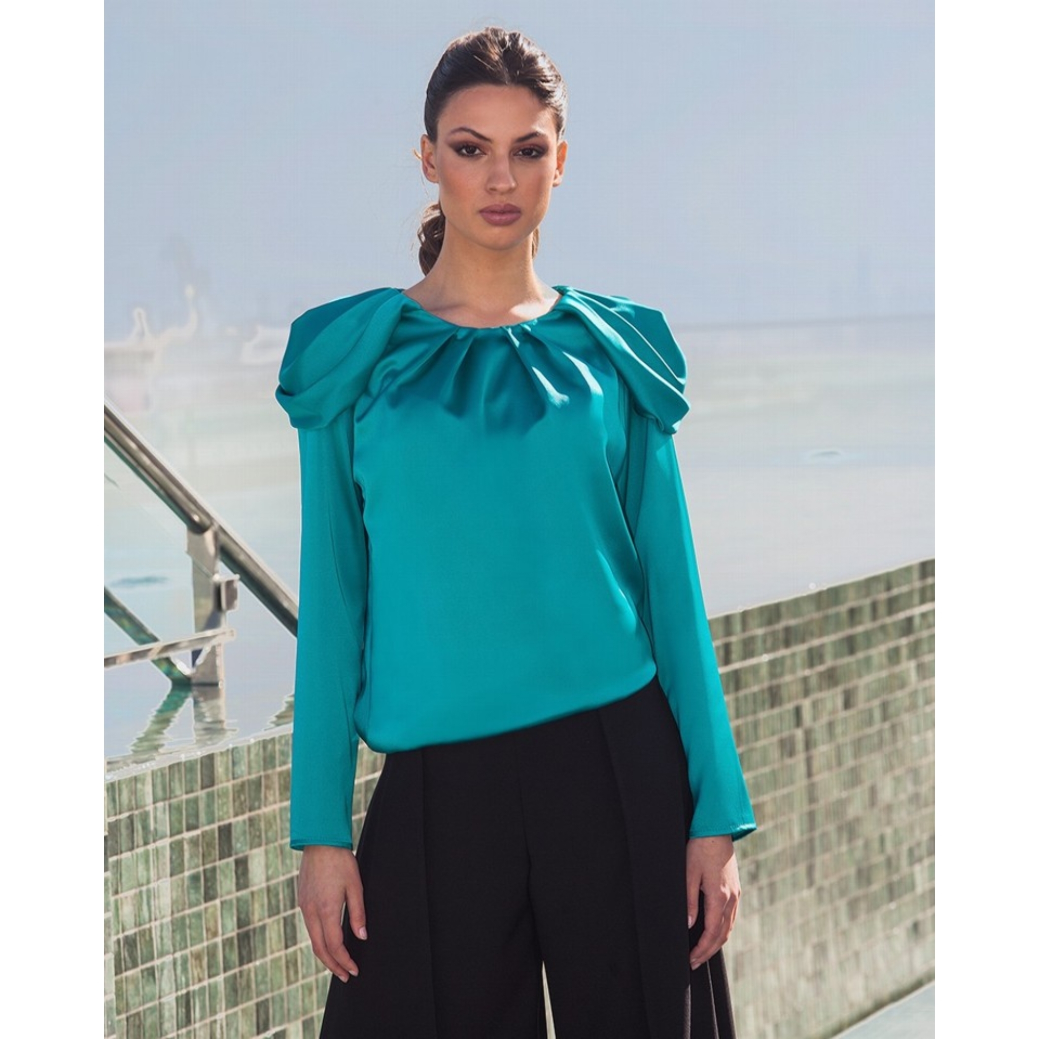 Blusa de cuello redondo, con volantes en los hombros, cierre trasero de un botón en el cuello. Se hace desde la talla 38 hasta la 52, también en color marfil.