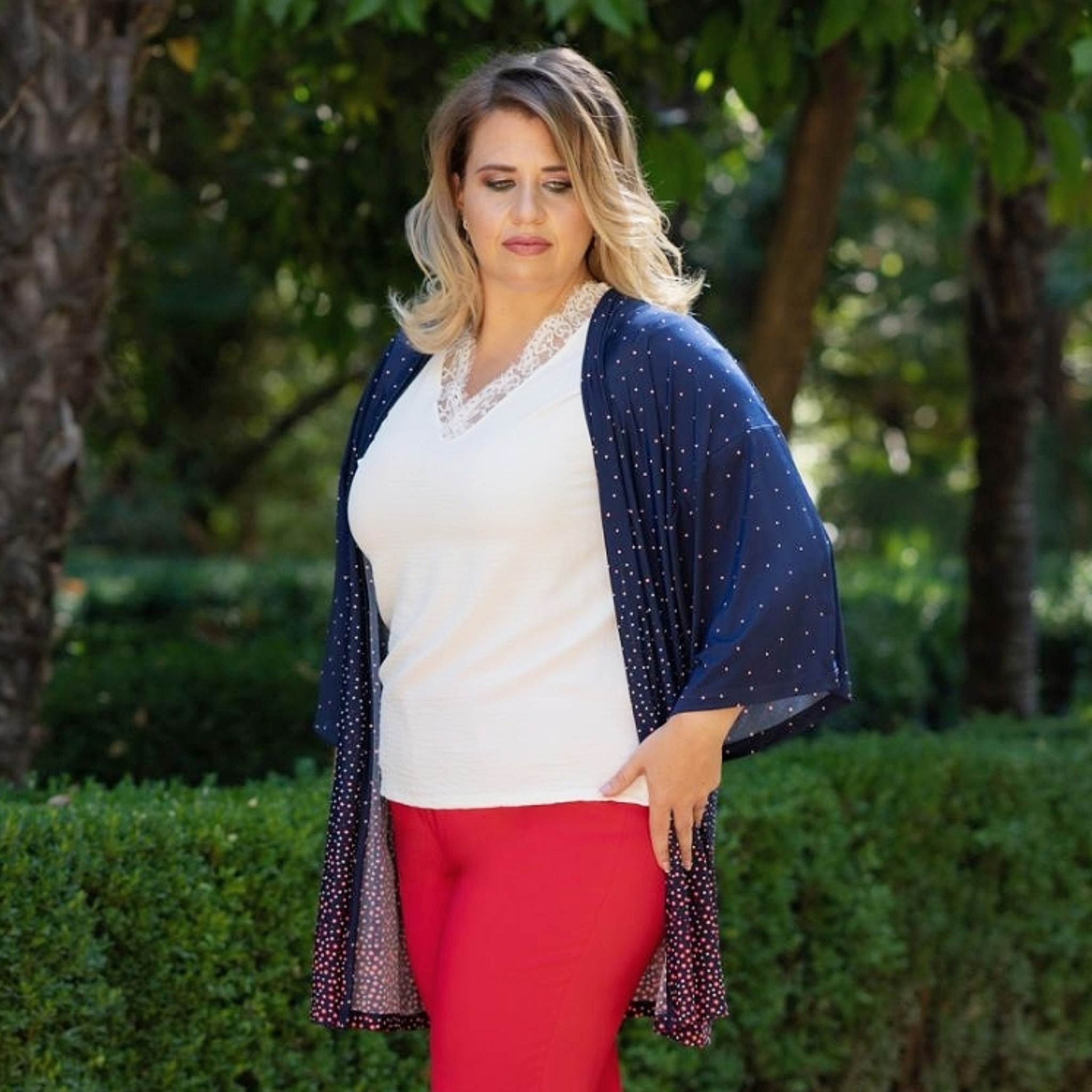 Blusa tipo lencera, con mangas cortas y escote de pico, detalles de blonda en mangas y escote. Se hace desde la talla 40 hasta la 62, en blanca, negra y fucsia.