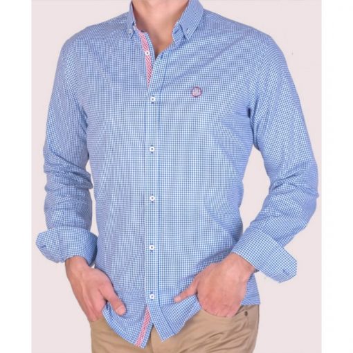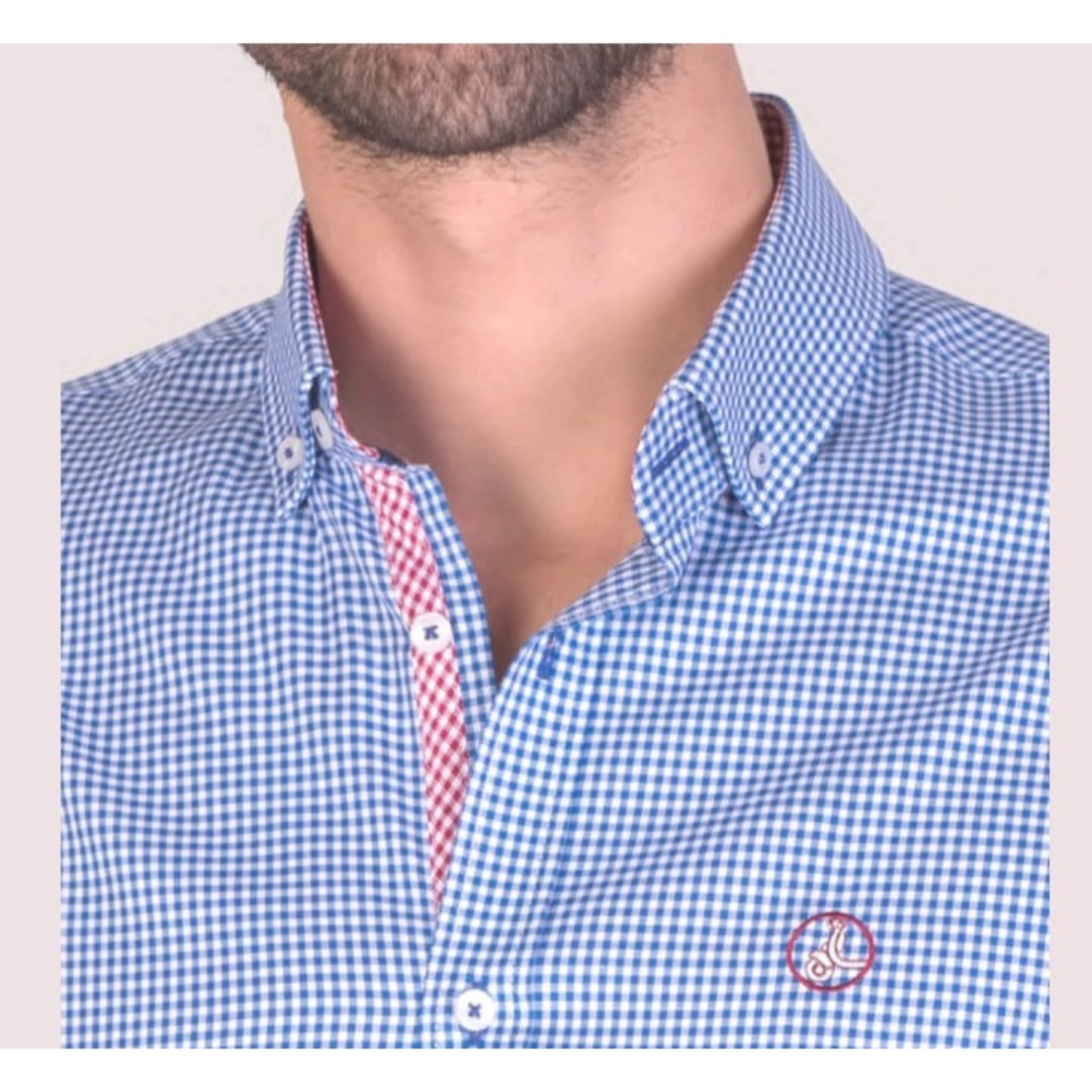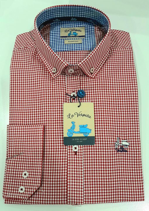 Camisa de cuadros La Vespita. Patrón semientallado. Logotipo de la marca bordado en el pecho y botón en el cuello, 100% algodón. Disponible en azul y roja.