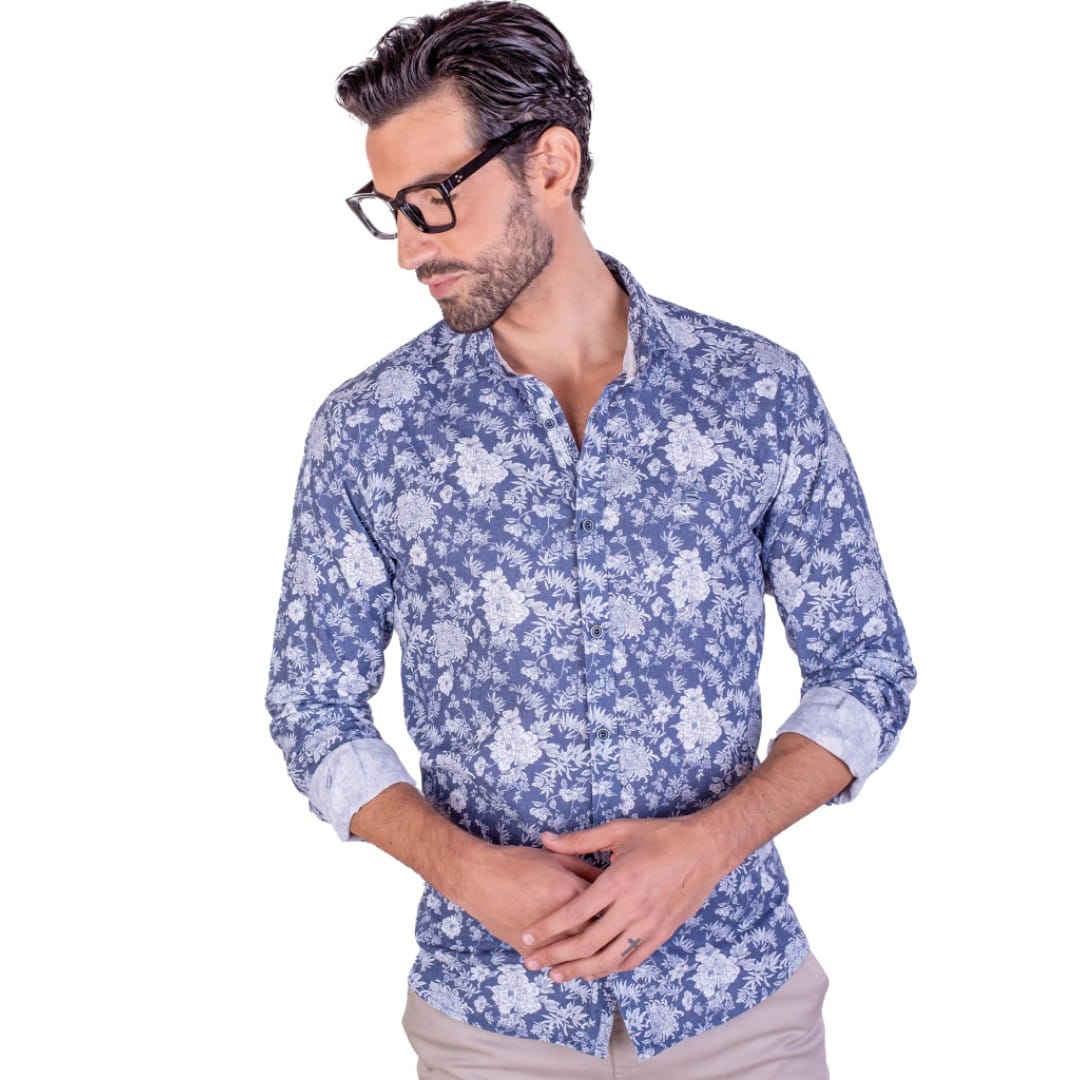 Camisa juvenil con estampado floral, entallada, manga larga.  Logo de la marca bordado en el pecho.  Tejido elegante que combina suavidad, durabilidad y transpirabilidad. Disponible en azul. Camisas confeccionadas en España.