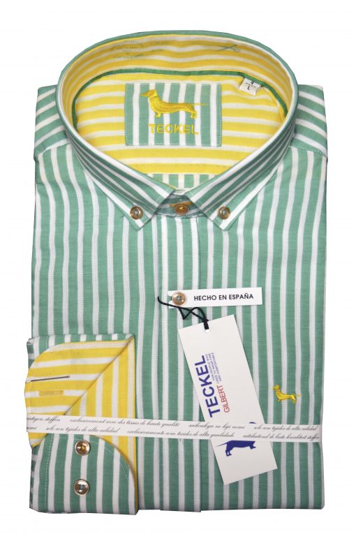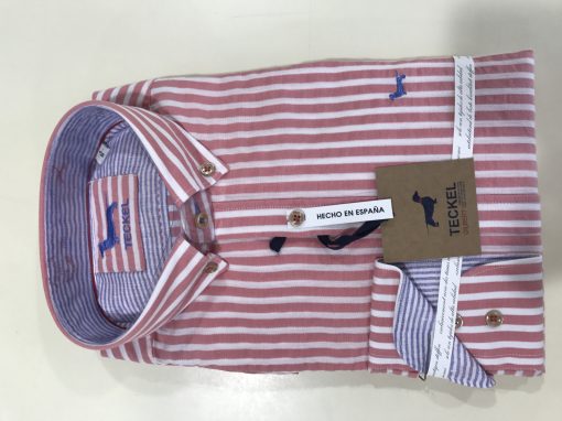 Camisa de rayas sin bolsillos, con mangas largas y botones. Disponible en la talla S hasta la XL, en verde y coral.