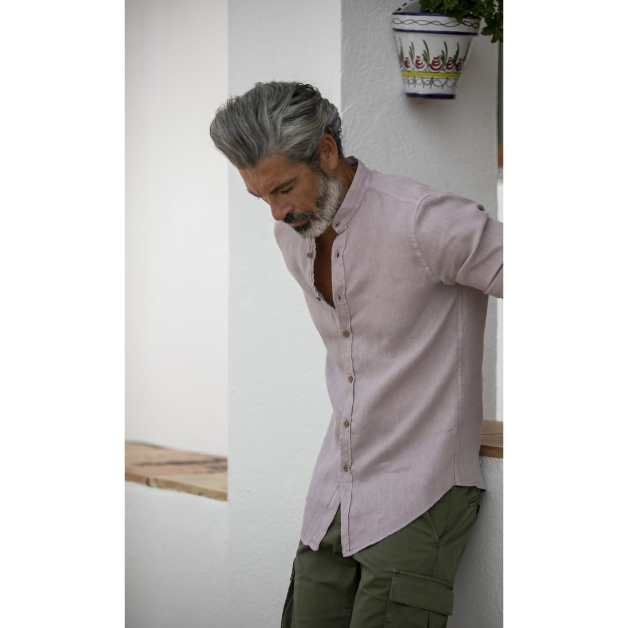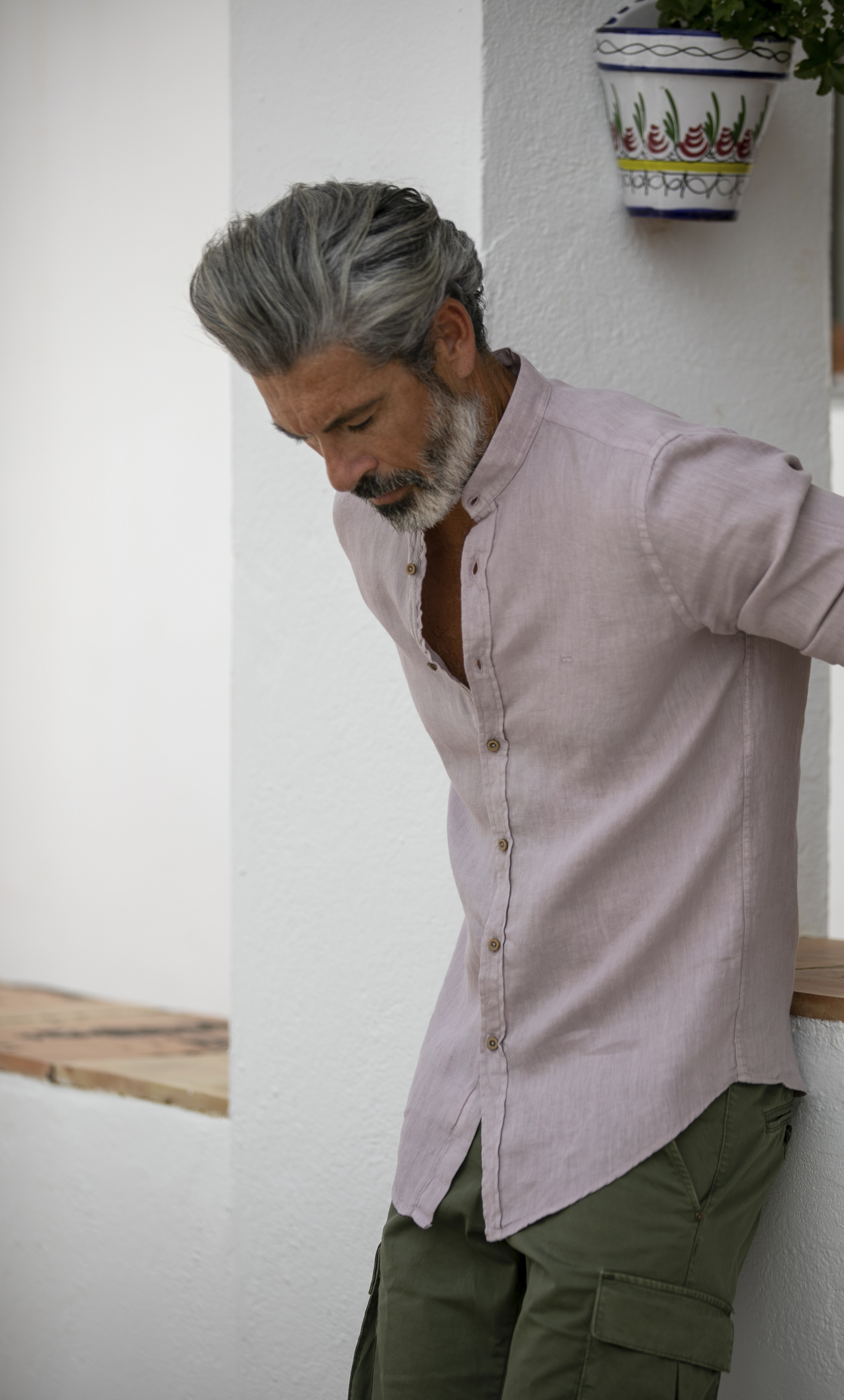 Camisa lino cuello Mahou, 100% lino tejido muy fresco para el verano, patrón Modert Fit, fabricado en España. disponible en beige y blanca. Marca Carlos Córdoba.