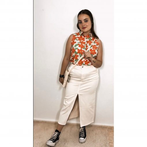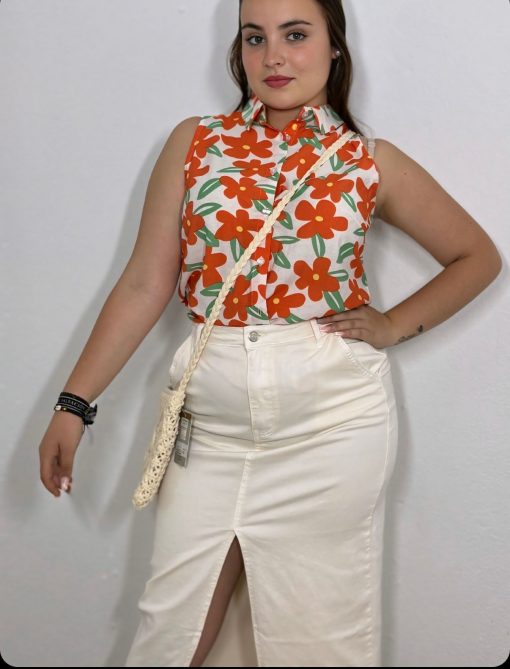 Camisa sin mangas, con cuello de solapas, y cierre delantero de botones. Estampada de flores naranjas con hojas verdes. Se hace desde la talla, S hasta la talla XXL.
