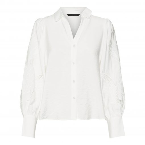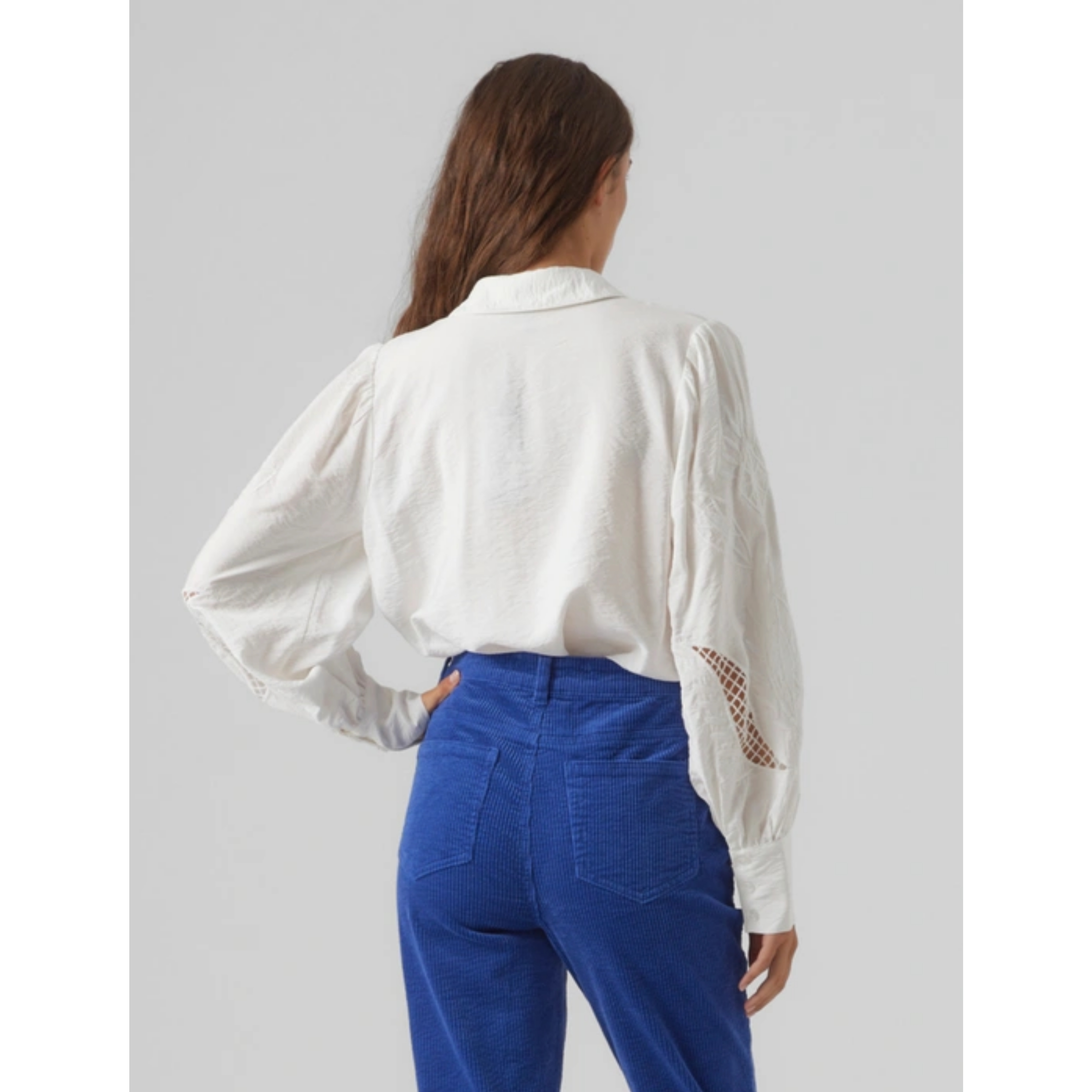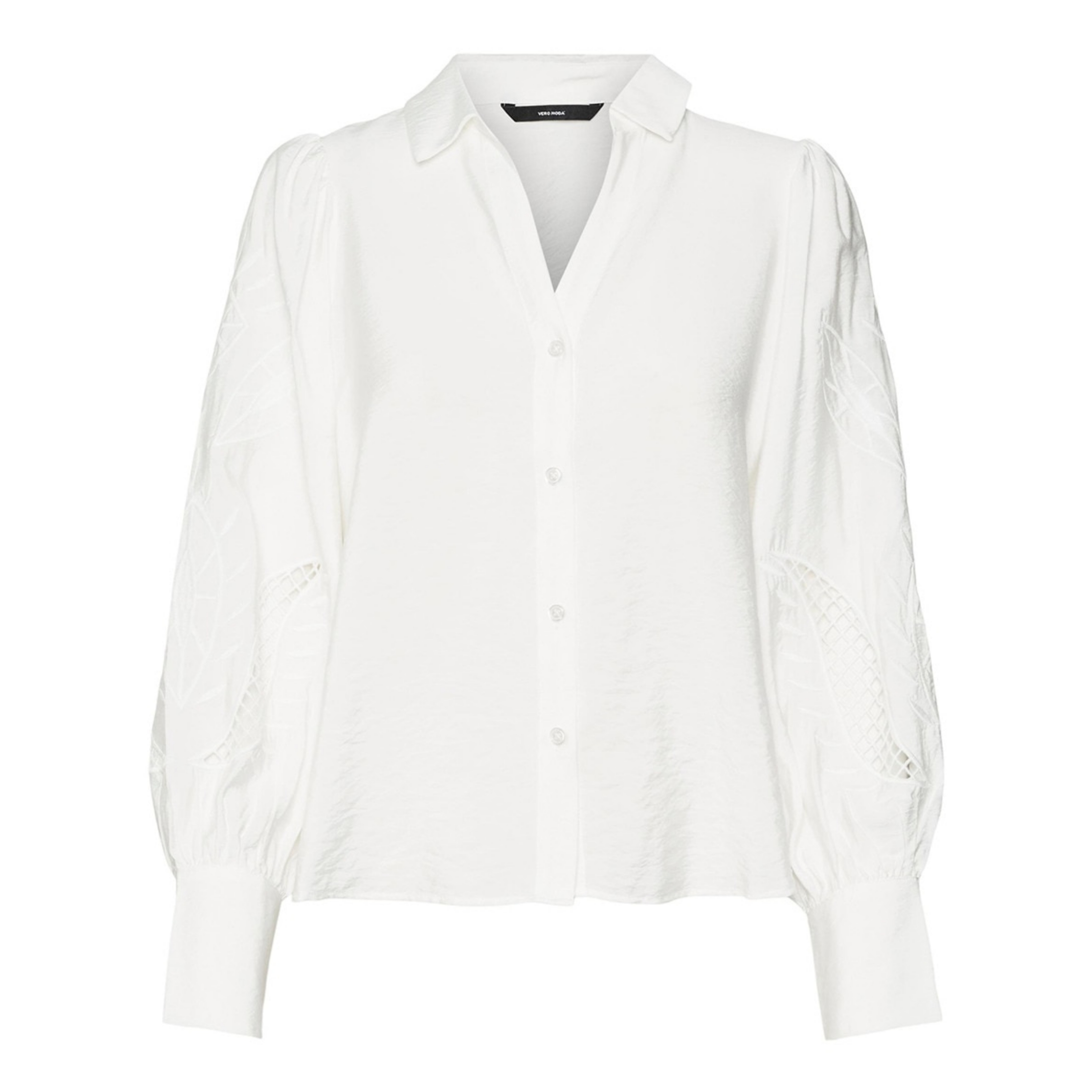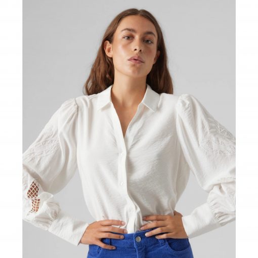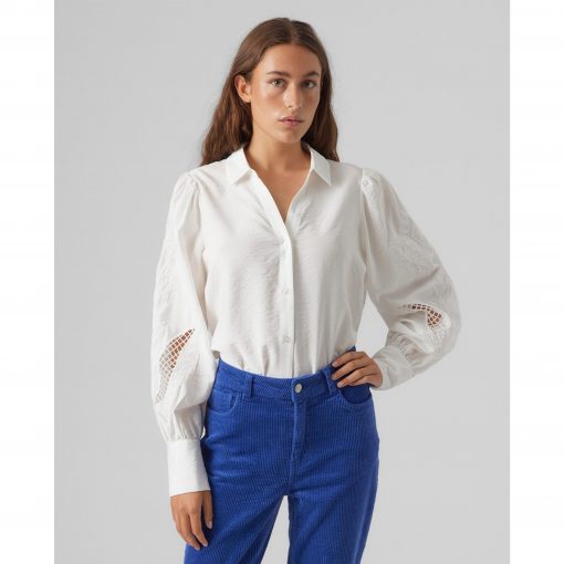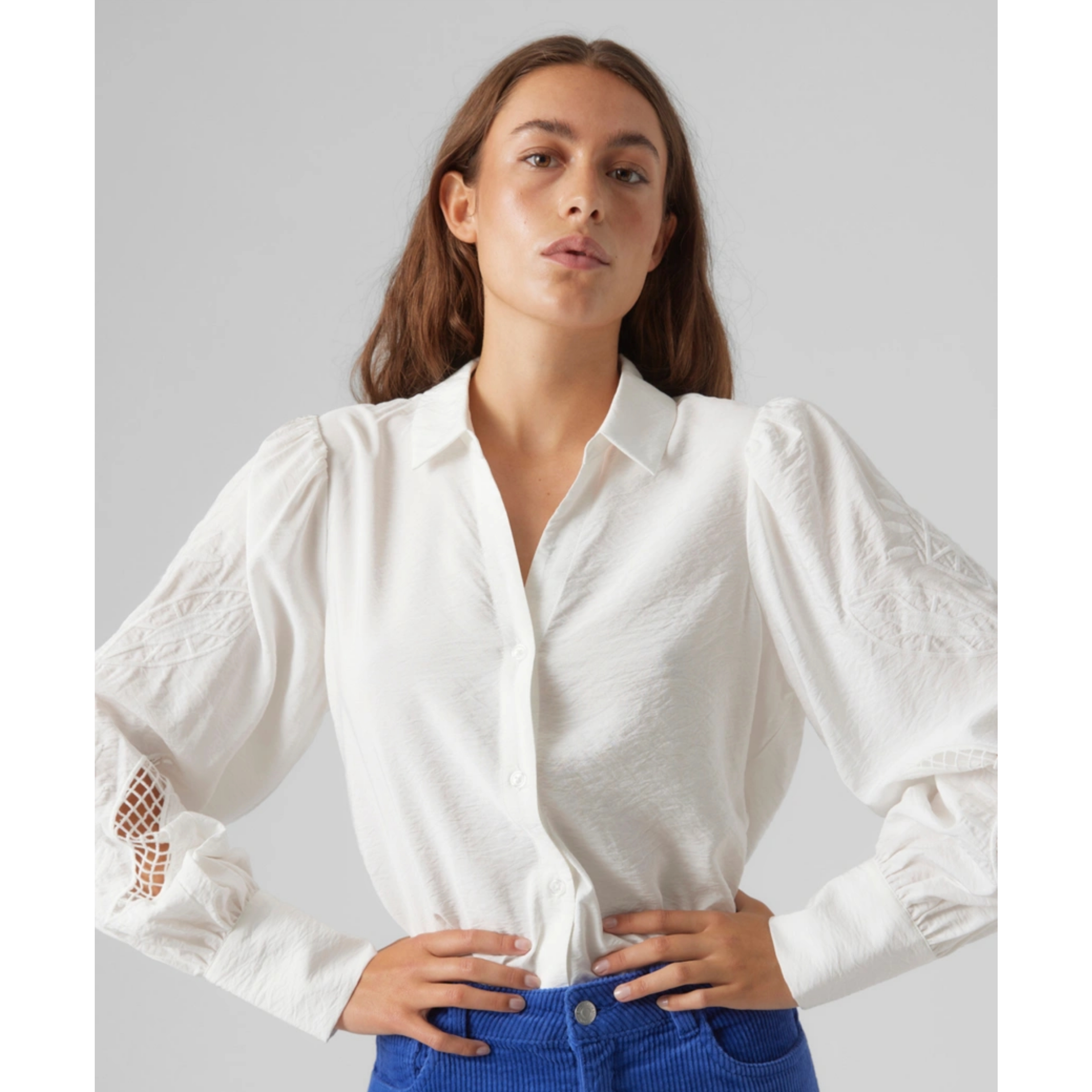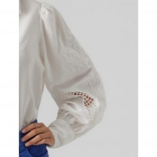 Camisa con cuello de pico y solapas, cierre delantero con botones, mangas abullonadas, bordadas y caladas. Se hace desde la talla S hasta la XL.