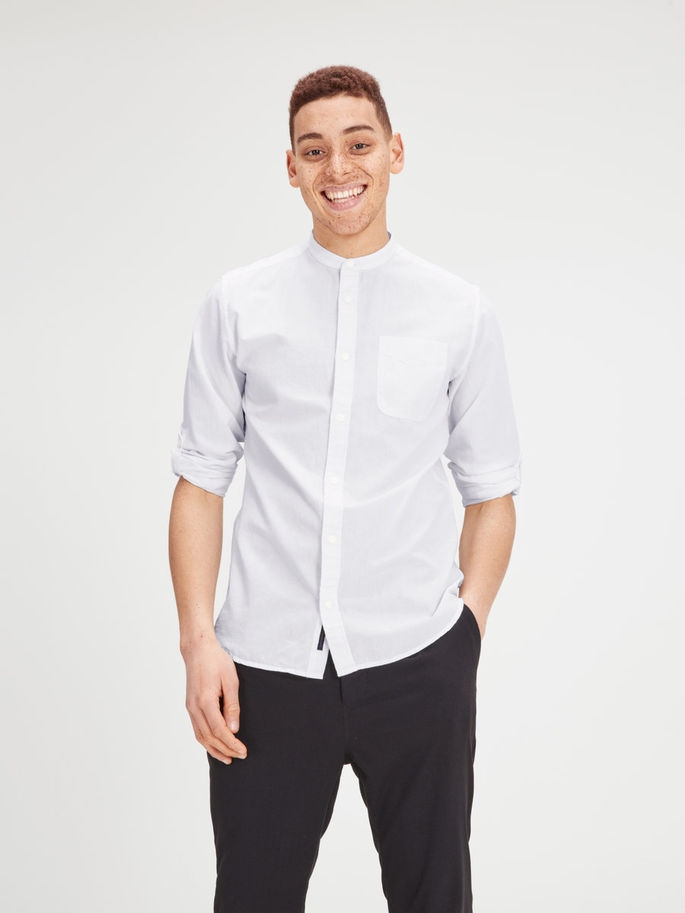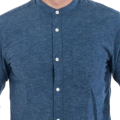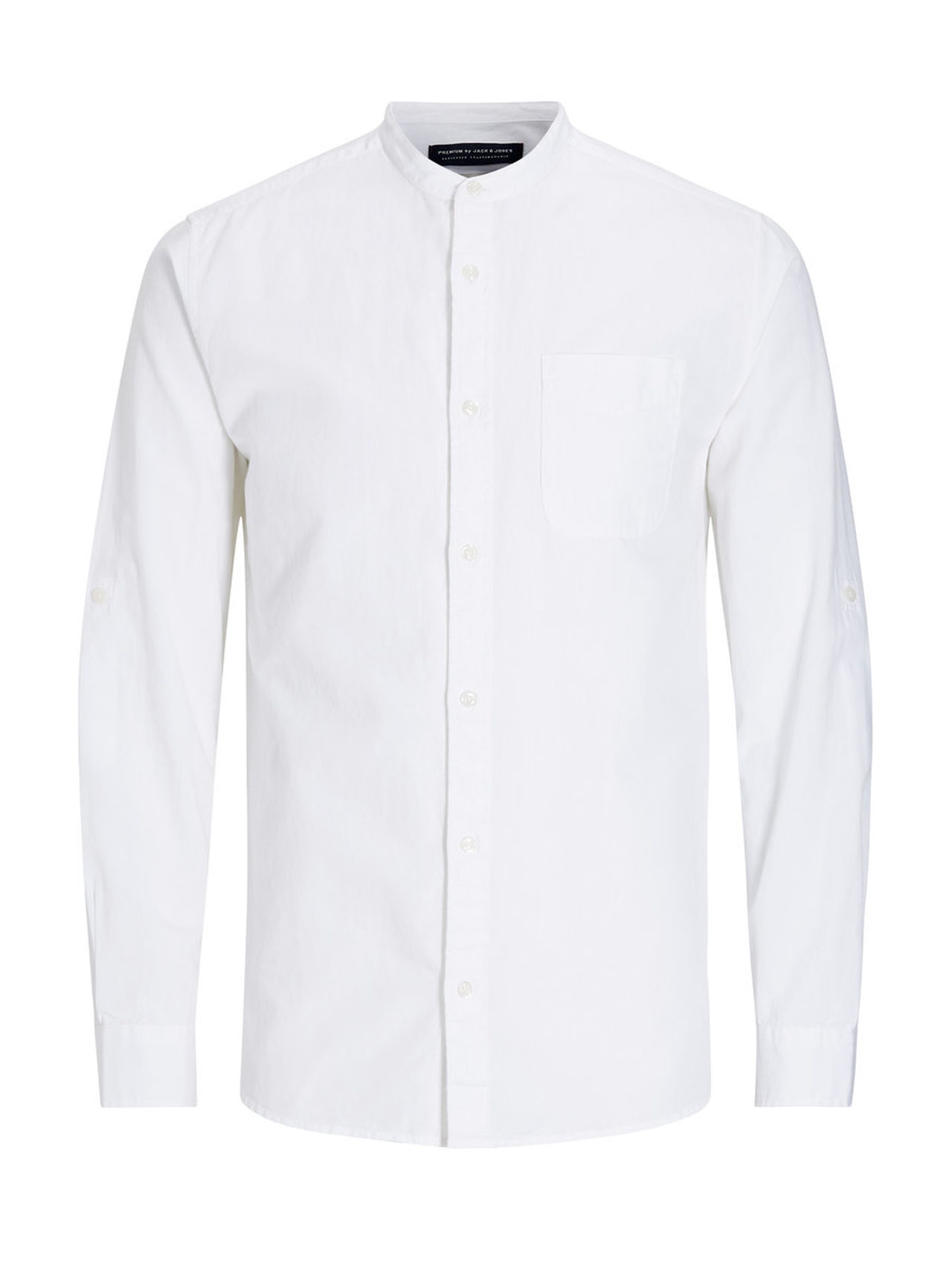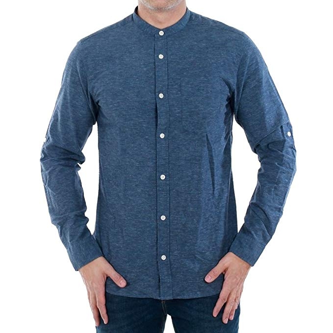 Camisa lisa de lino, con mangas largas, cuello mao, y bolsillo en el pecho. Disponible desde la talla L hasta la XXL, en Blanca y en azul.