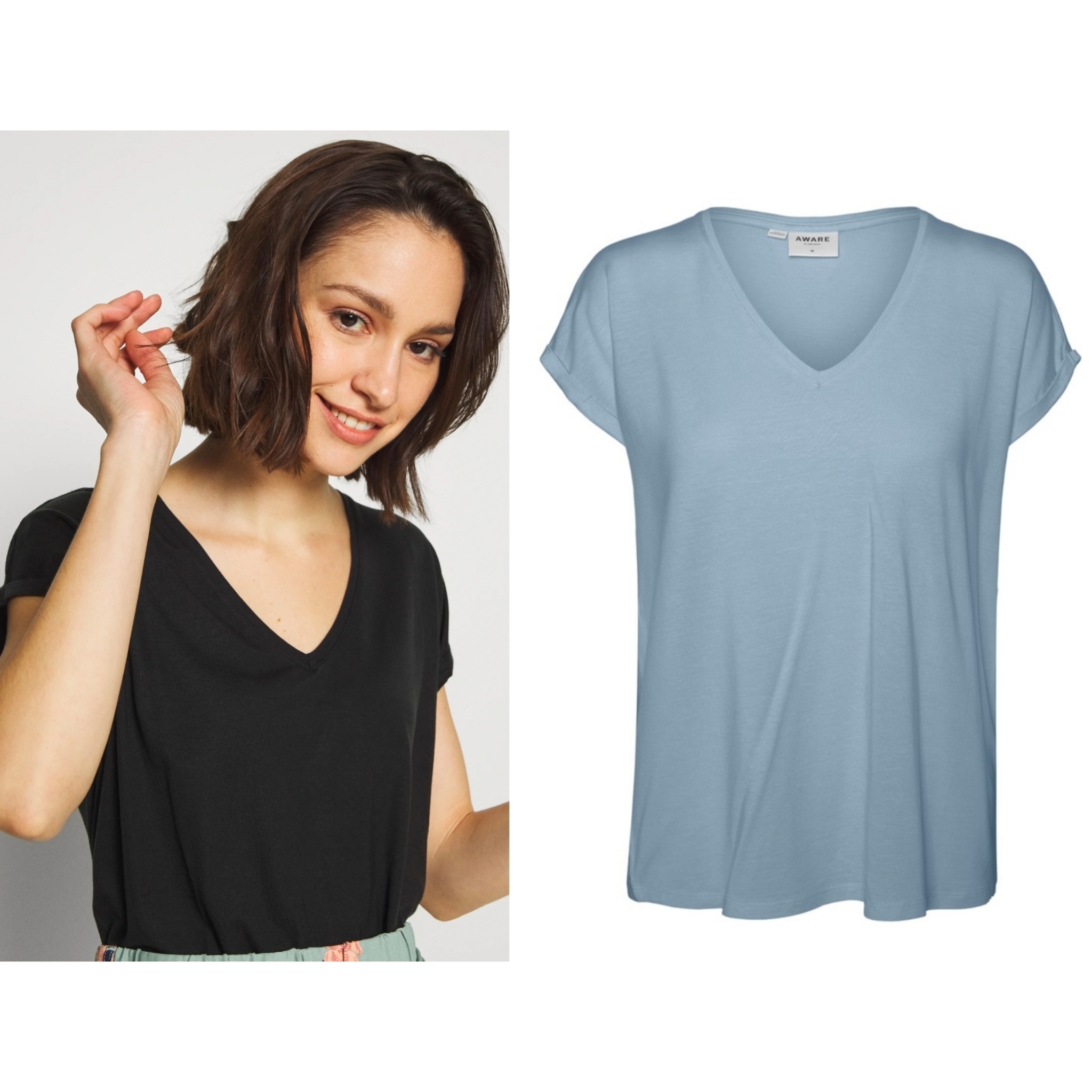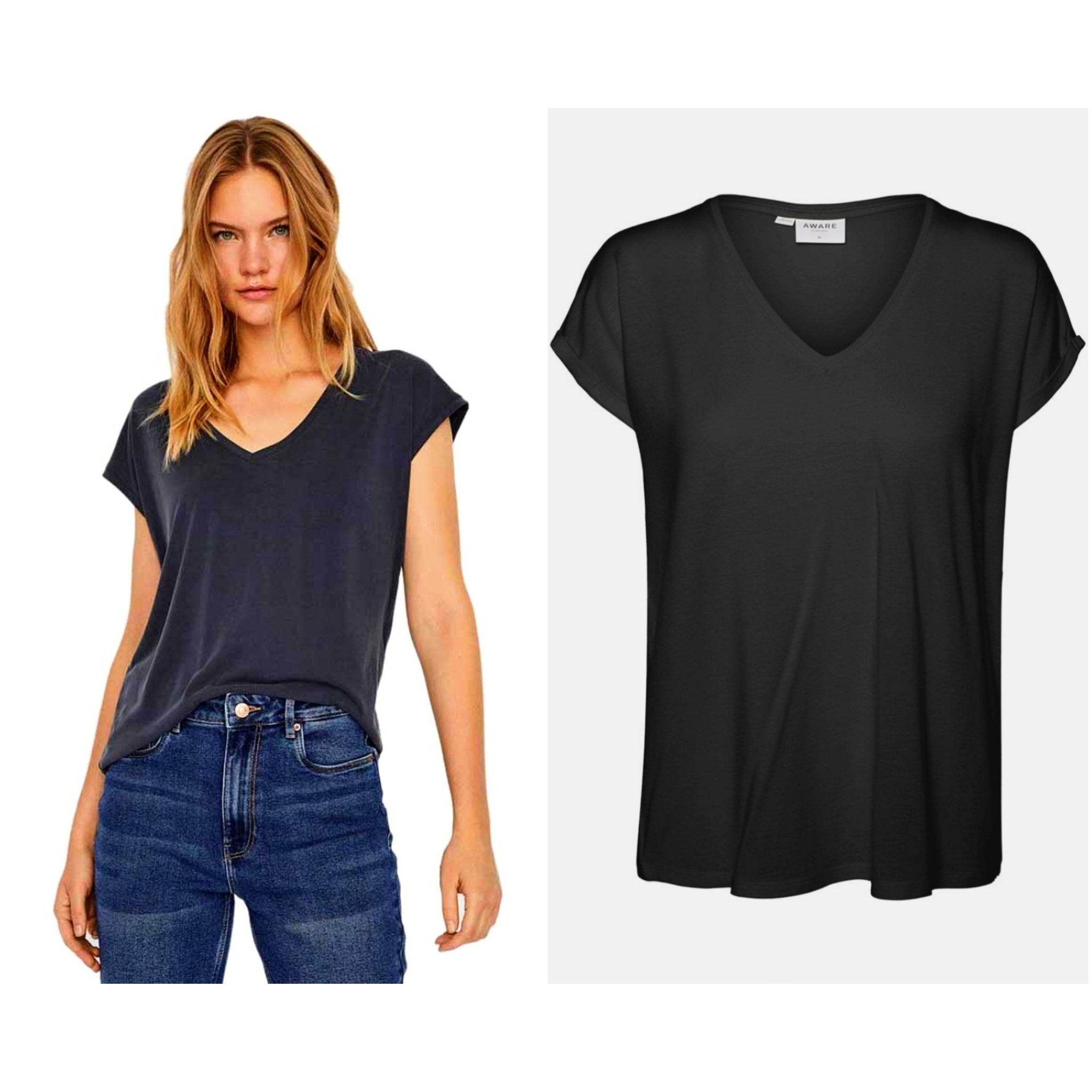 Camiseta de mangas cortas, con vuelta en la manga, cuello de pico, disponible en negra y en celeste, desde la talla xs hasta la xl.