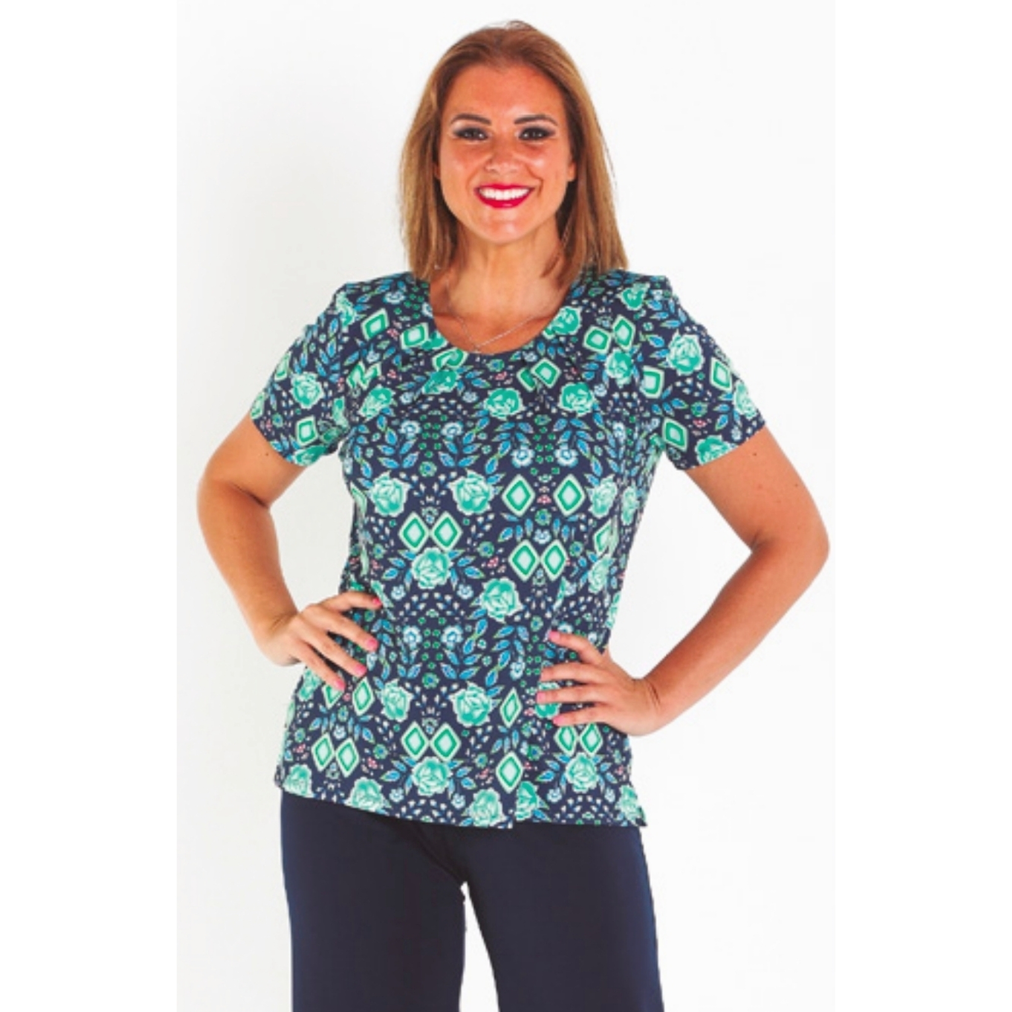 Camiseta de punto de licra, con hombreras, cuello redondo y mangas cortas, fruncida en el pecho, estampada de flores. Se hace desde la talla 40 hasta la 64.