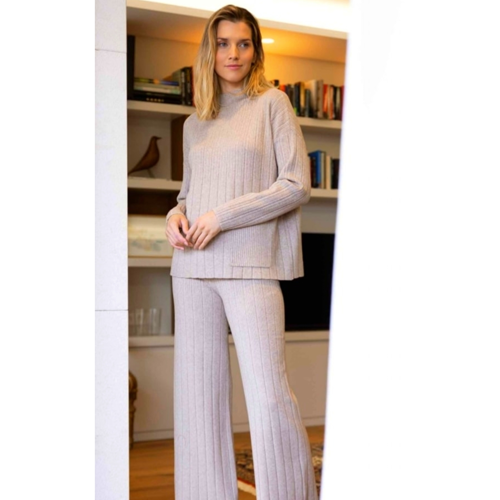 Conjunto de tejido de punto de canalé, muy suave, formado por parte de arriba con cuello a la caja, mangas largas y bolsillos laterales y pantalón con cinturilla elástica acampanado. Disponible desde la talla M, L Y xl.