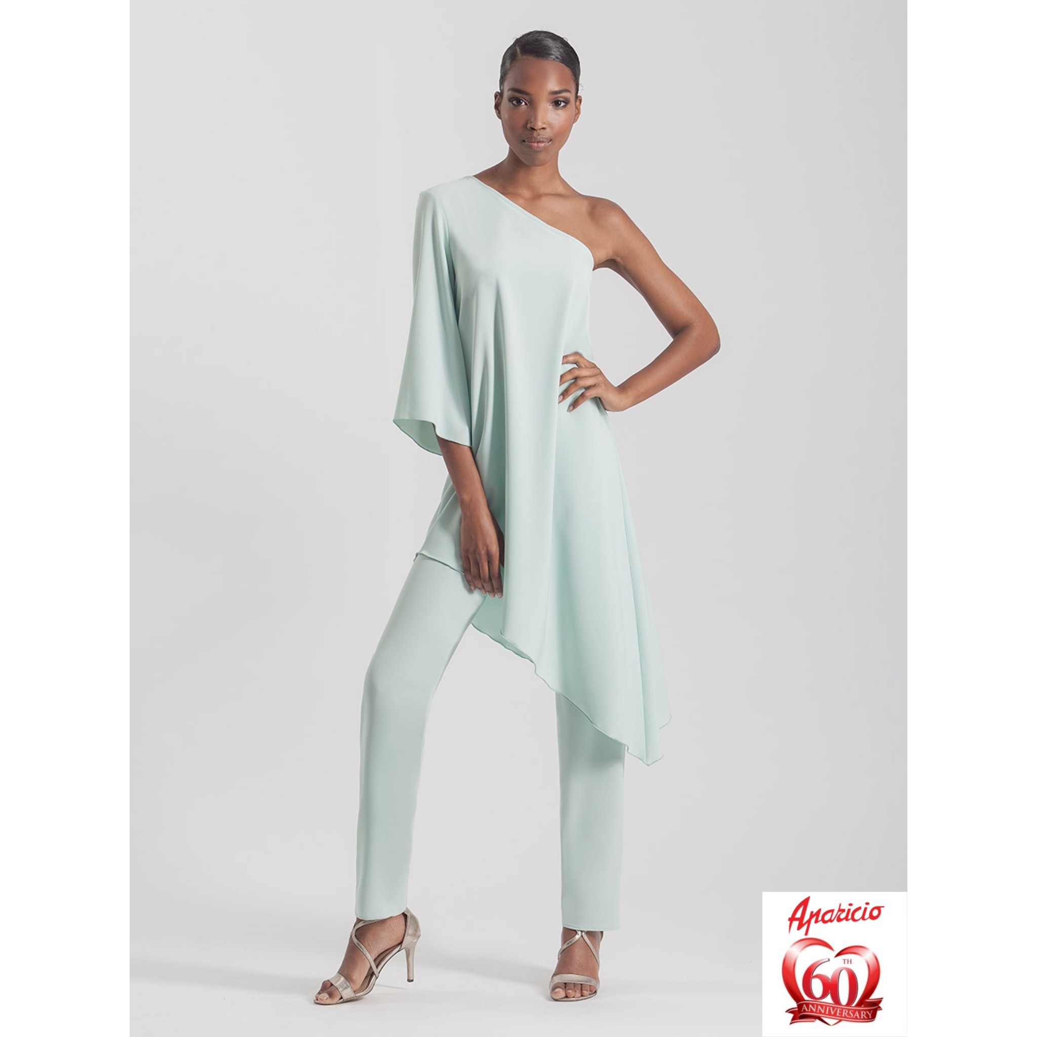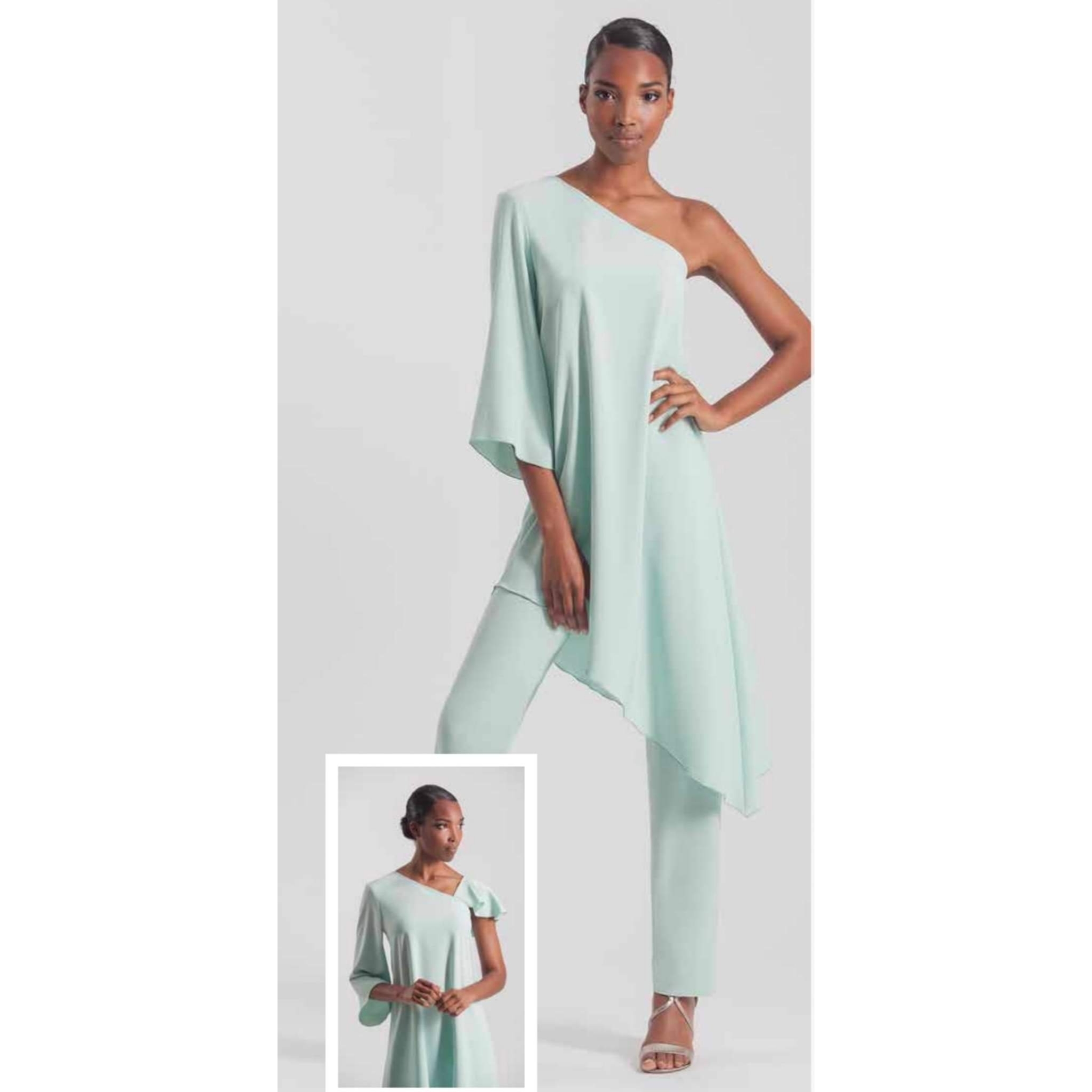 Conjunto compuesto por parte de arriba, con escote asimétrico, con una manga. (incluye tela, para posibilidad de coser en el hombro, descubierto a modo de capa o volante). SE hace desde la talla 38 hasta la 52, en blanco y en verde agua.