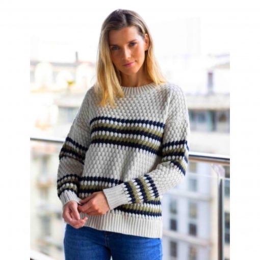 Jersey de punto, con cuello redondo, con estampado de rayas en el pecho y en las mangas, se hace desde la talla s hasta la xxxl.