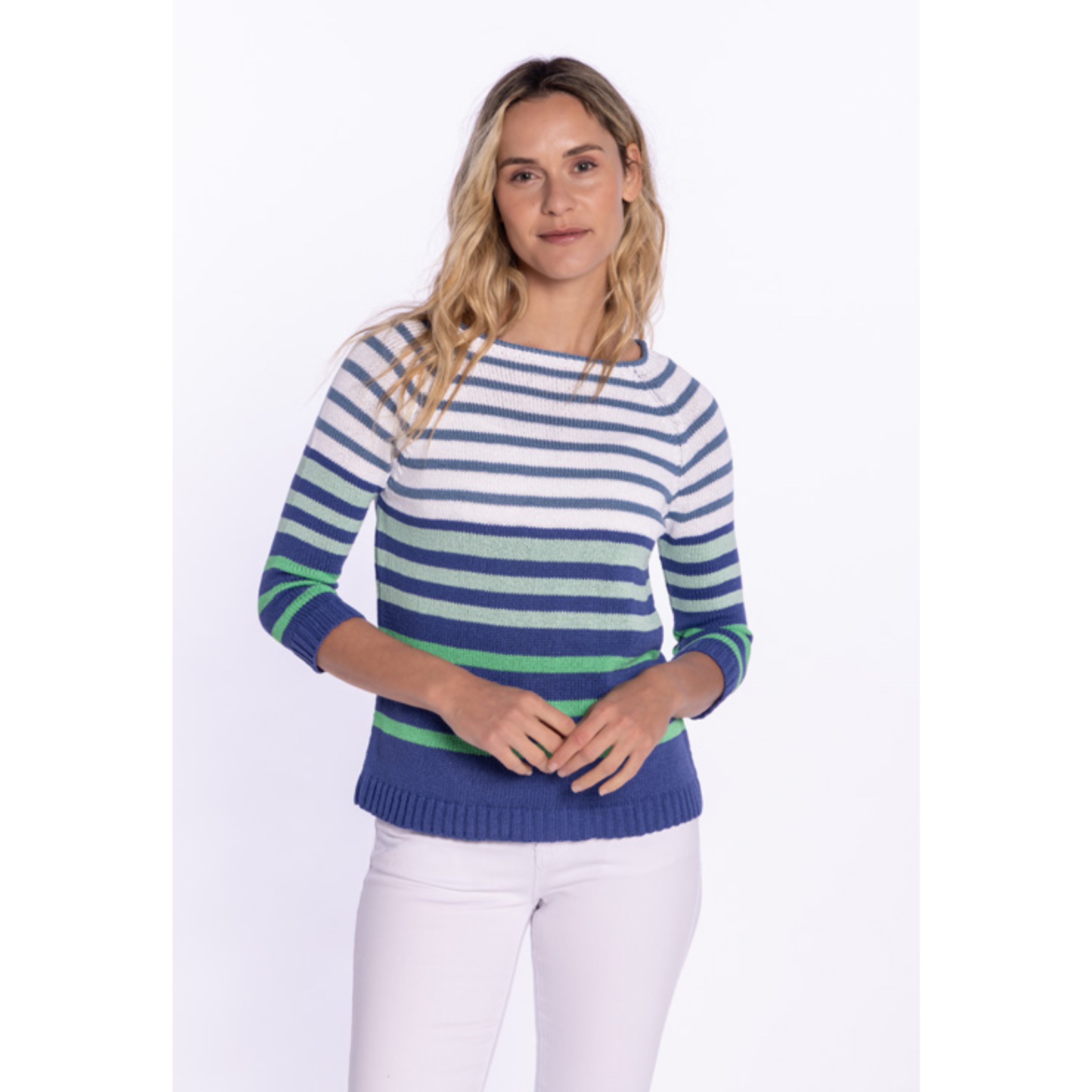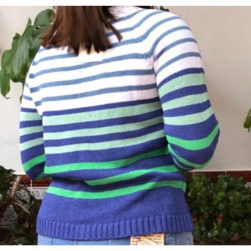 Jersey estampado de rayas, en hilo, de cuello redondo más abierto, mangas 3/4. Se hace desde la talla s hasta la xxl.