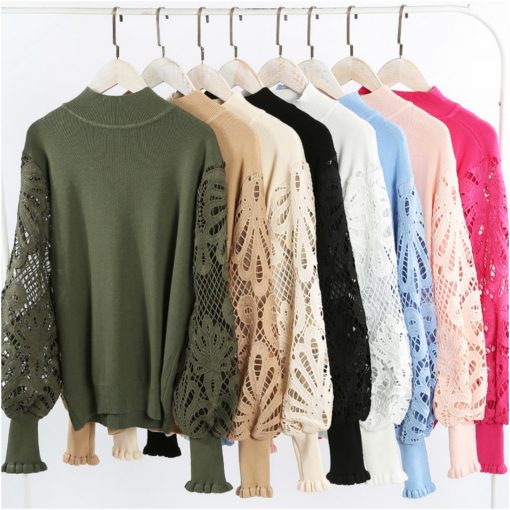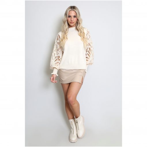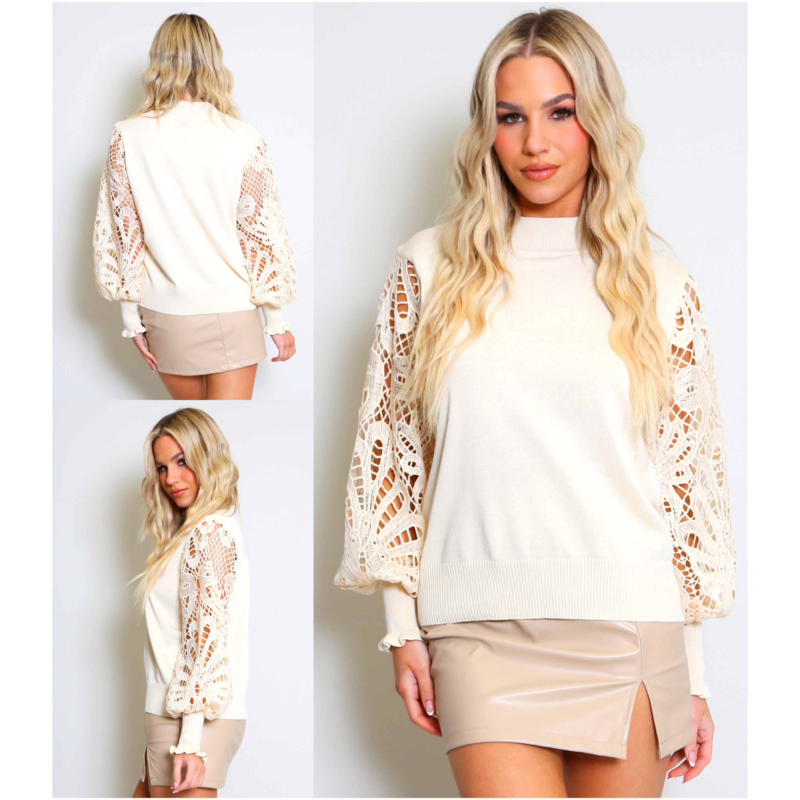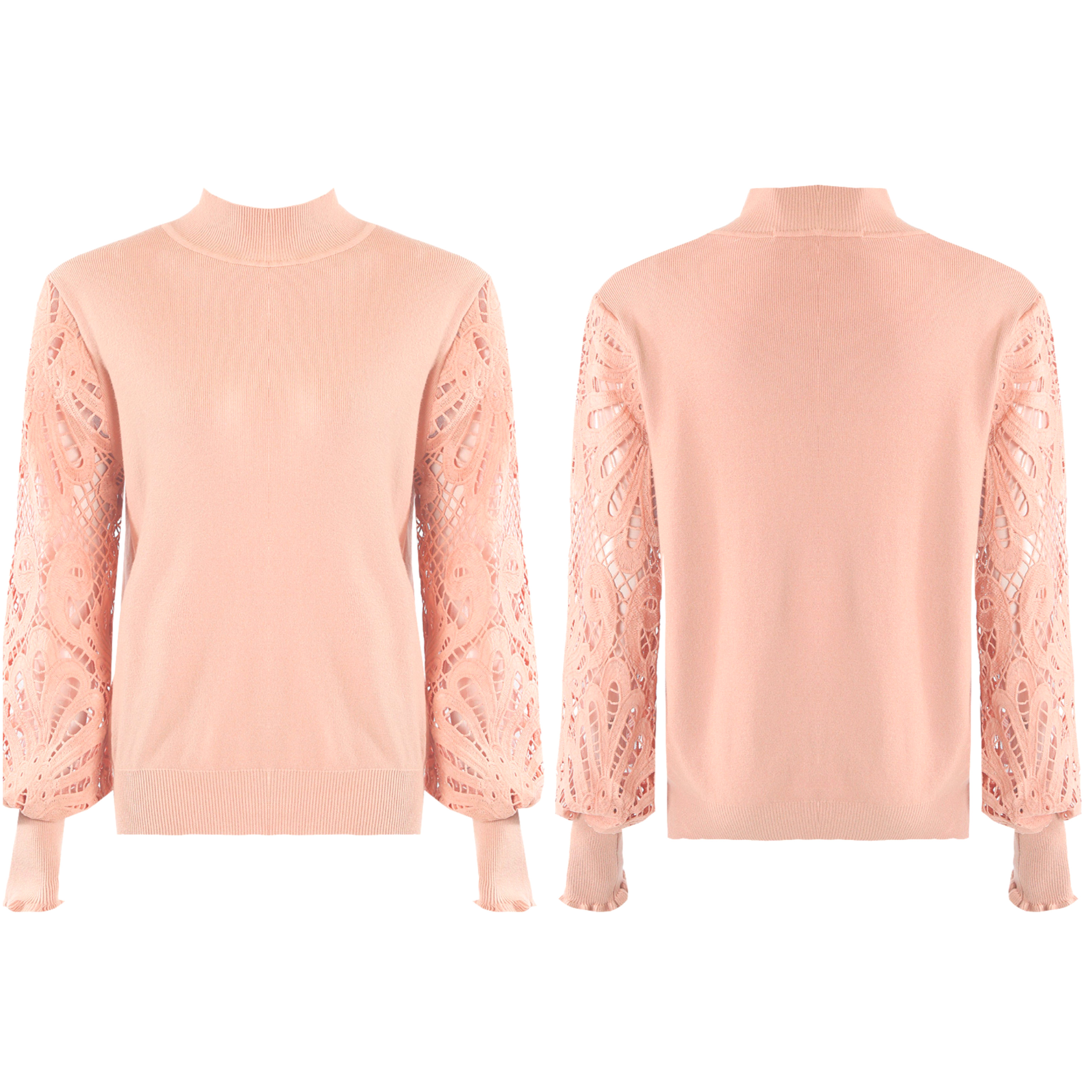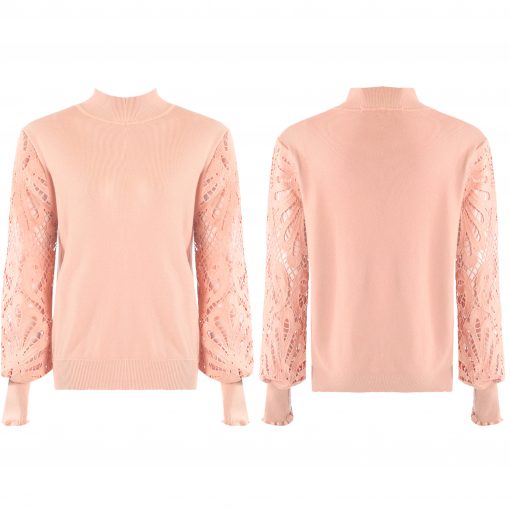 Jersey de punto fino, con cuello semi cisne, mangas largas caladas con tul y encaje de guipur. Talla única. Últimos colores disponibles ( salmón y beige) a precio de oferta.