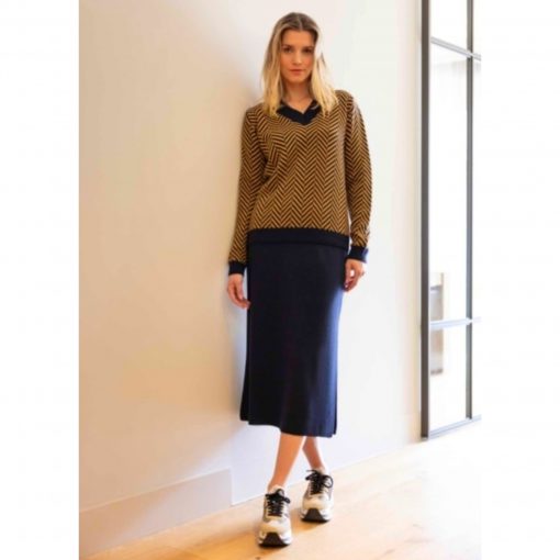 Jersey de punto, de mangas largas, con escote de pico, estampado de rayas, con vivos en el cuello, puños y en el bajo. Se hace desde la talla s hasta la xxxl, también disponible en estampado bicolor blanco y negro.