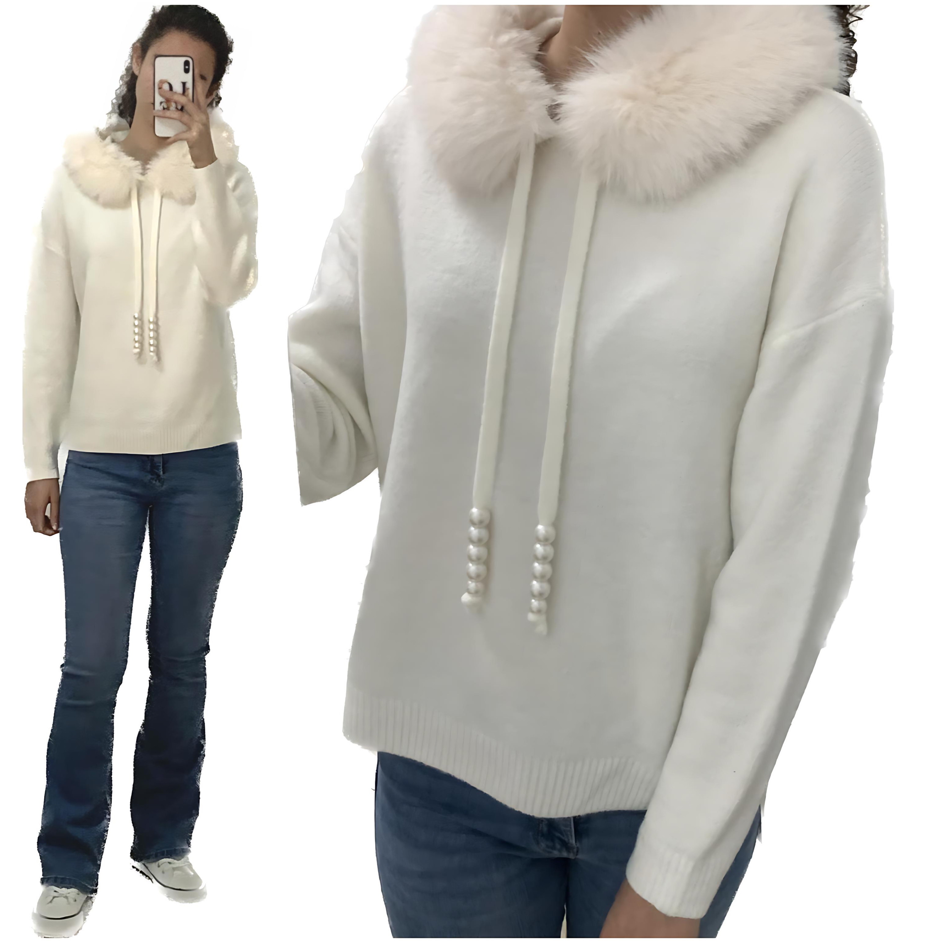 Jersey con capucha y cuello de pelo súper suave con cordones de perlas, desmontable. Talla única. Disponible en gris y crudo.