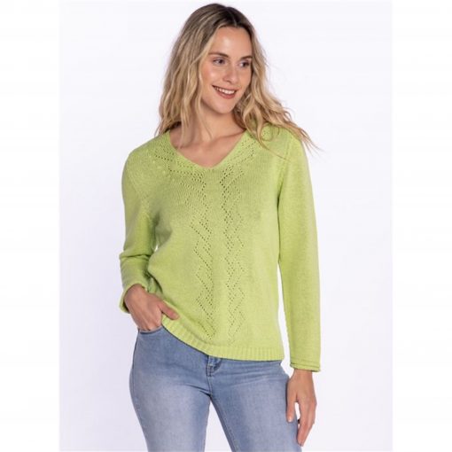 Jersey de hilo, con mangas 3/4, escote de pico, parte central, calada de dibujos geométricos. Se hace desde la talla s hasta la xxl.