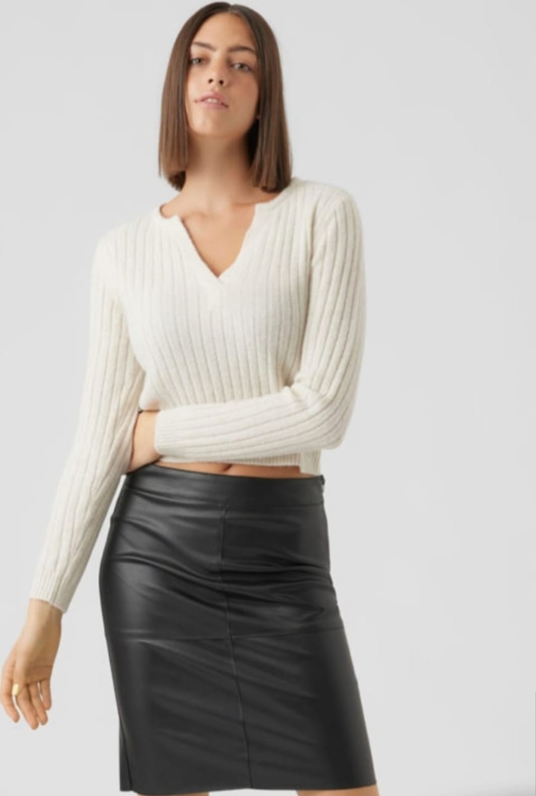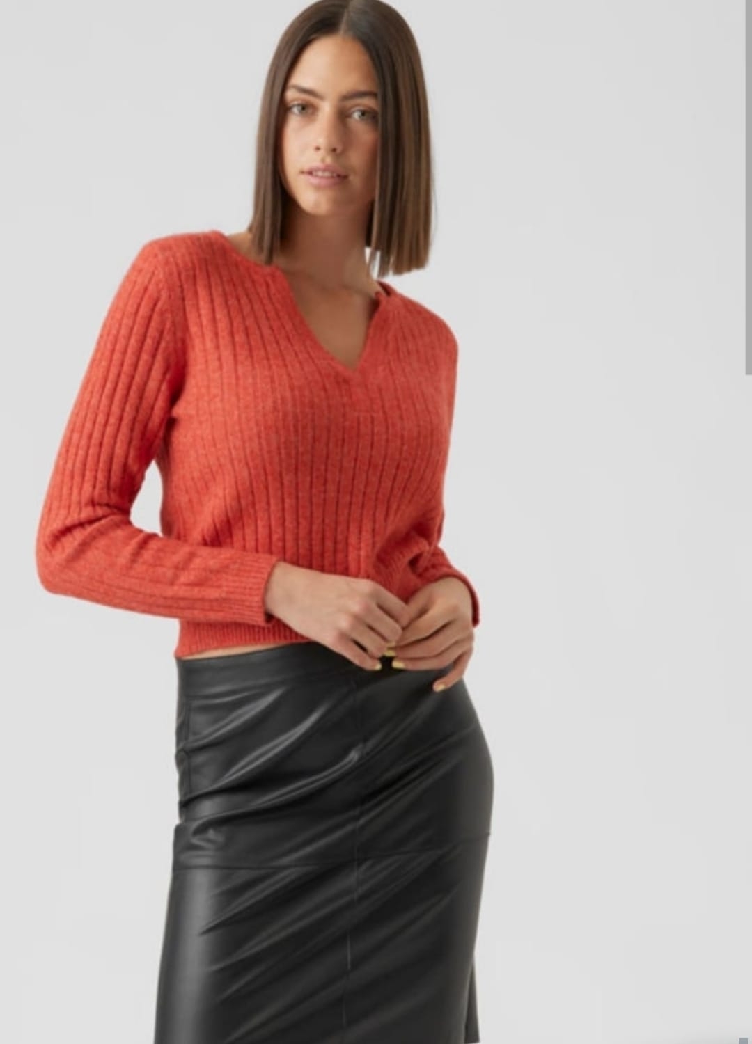Jersey corto, de punto de canalé, con escote de pico, se hace desde la talla xs hasta la xxxl, en color cazuela y en crudo.