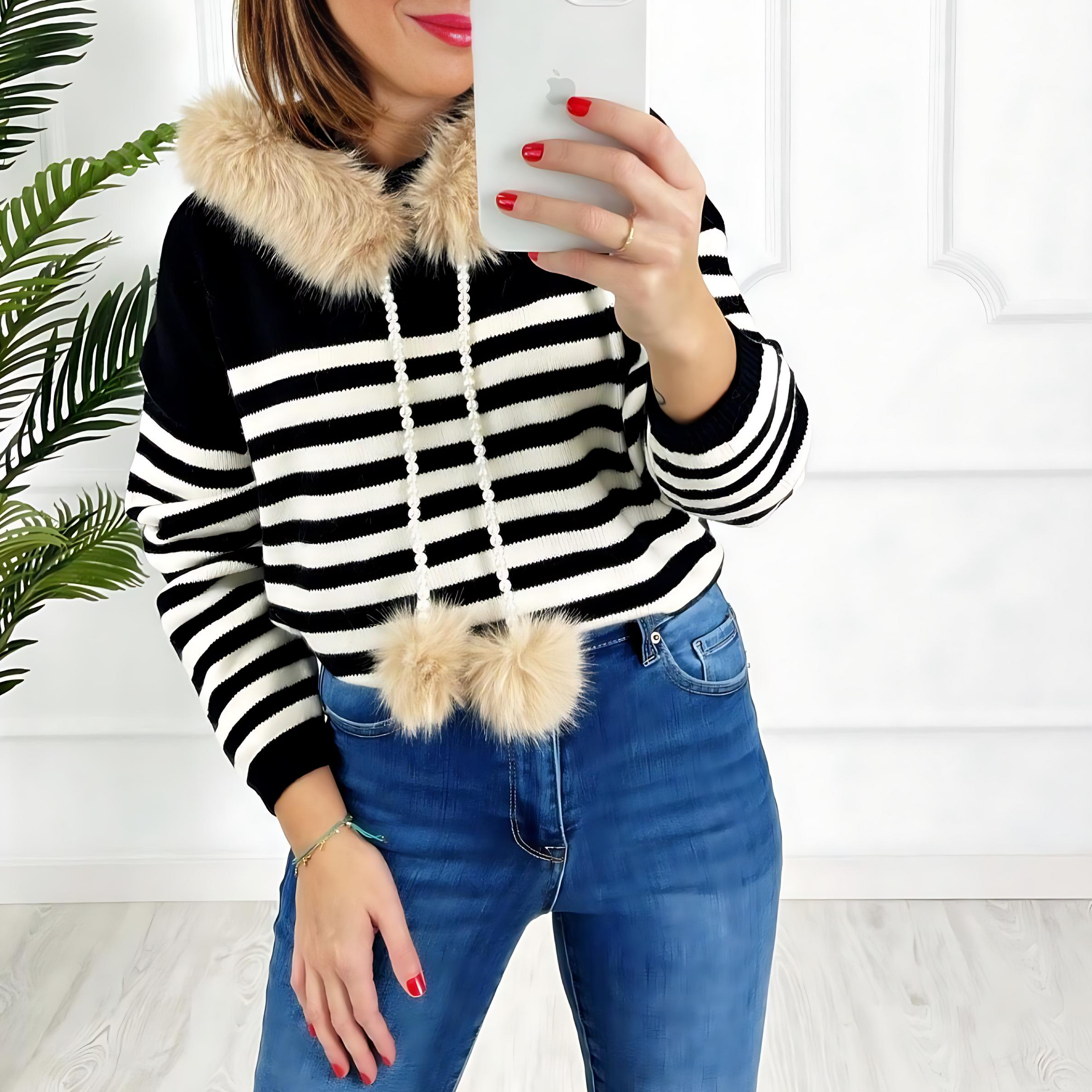 Jersey de rayas, con capucha de pelo y cordón de perlas con pompones.