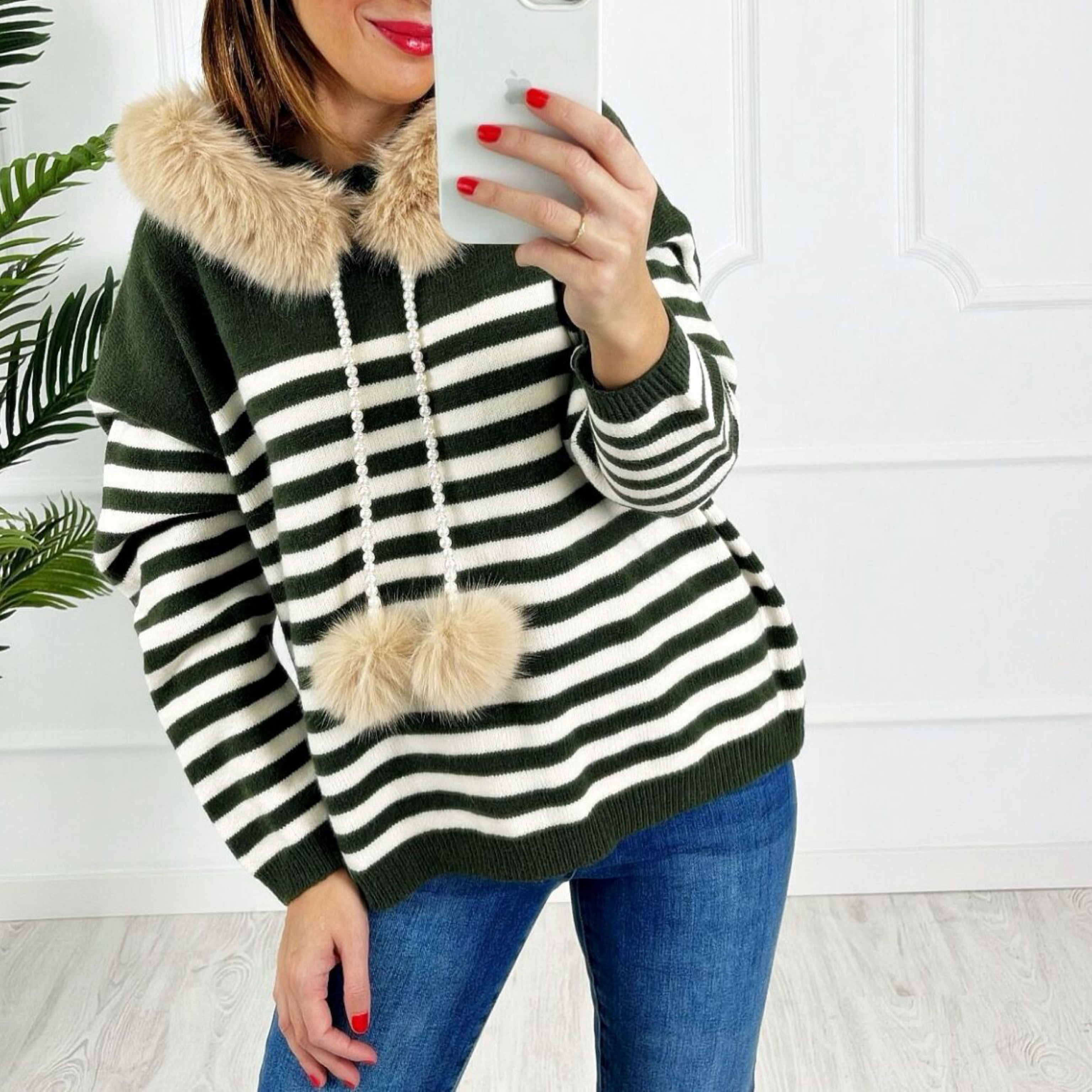Jersey de rayas con capucha y cuello de pelo súper suave con cordones de perlas y pompones, todo desmontable. Talla única. Disponible en azul marino y en verde kaki.