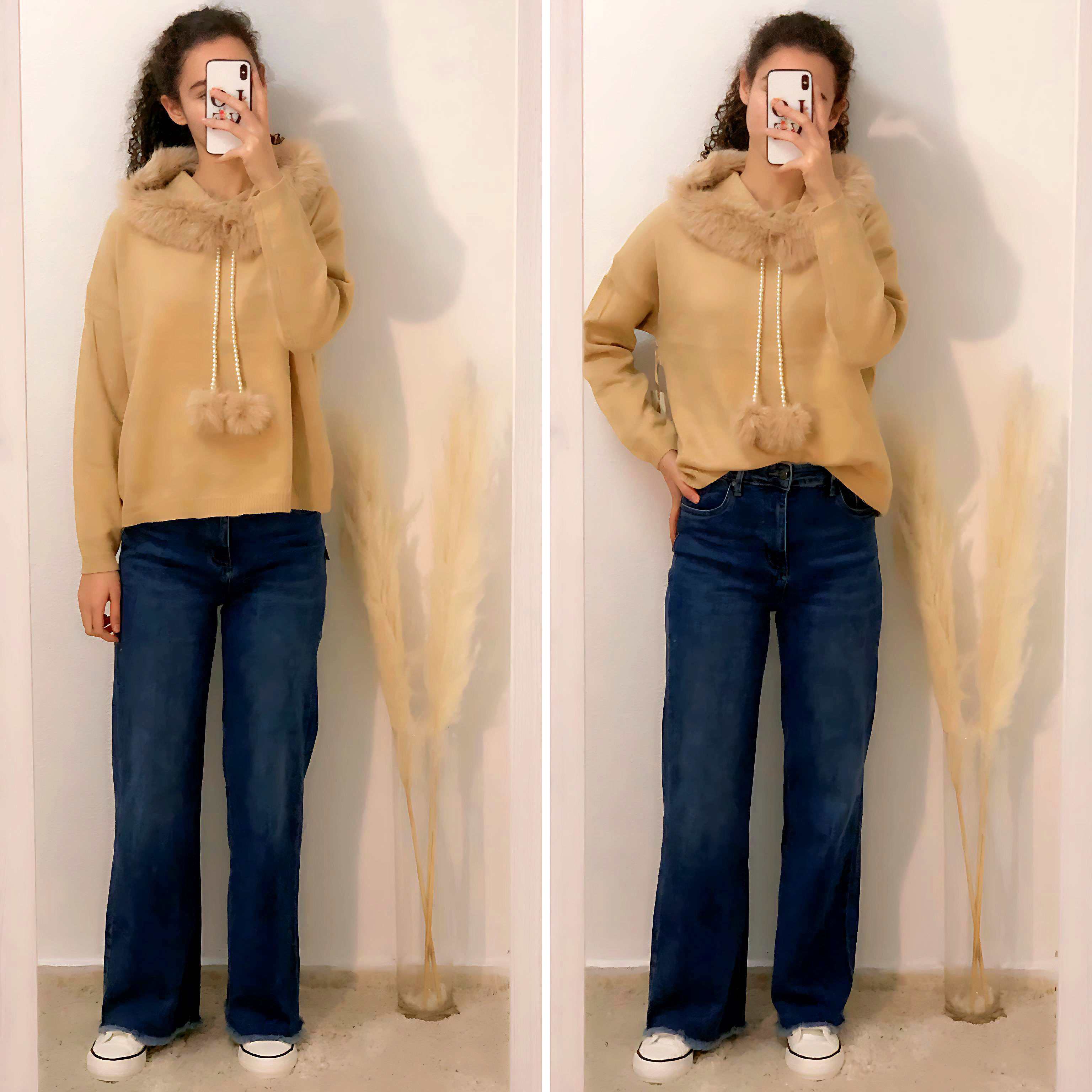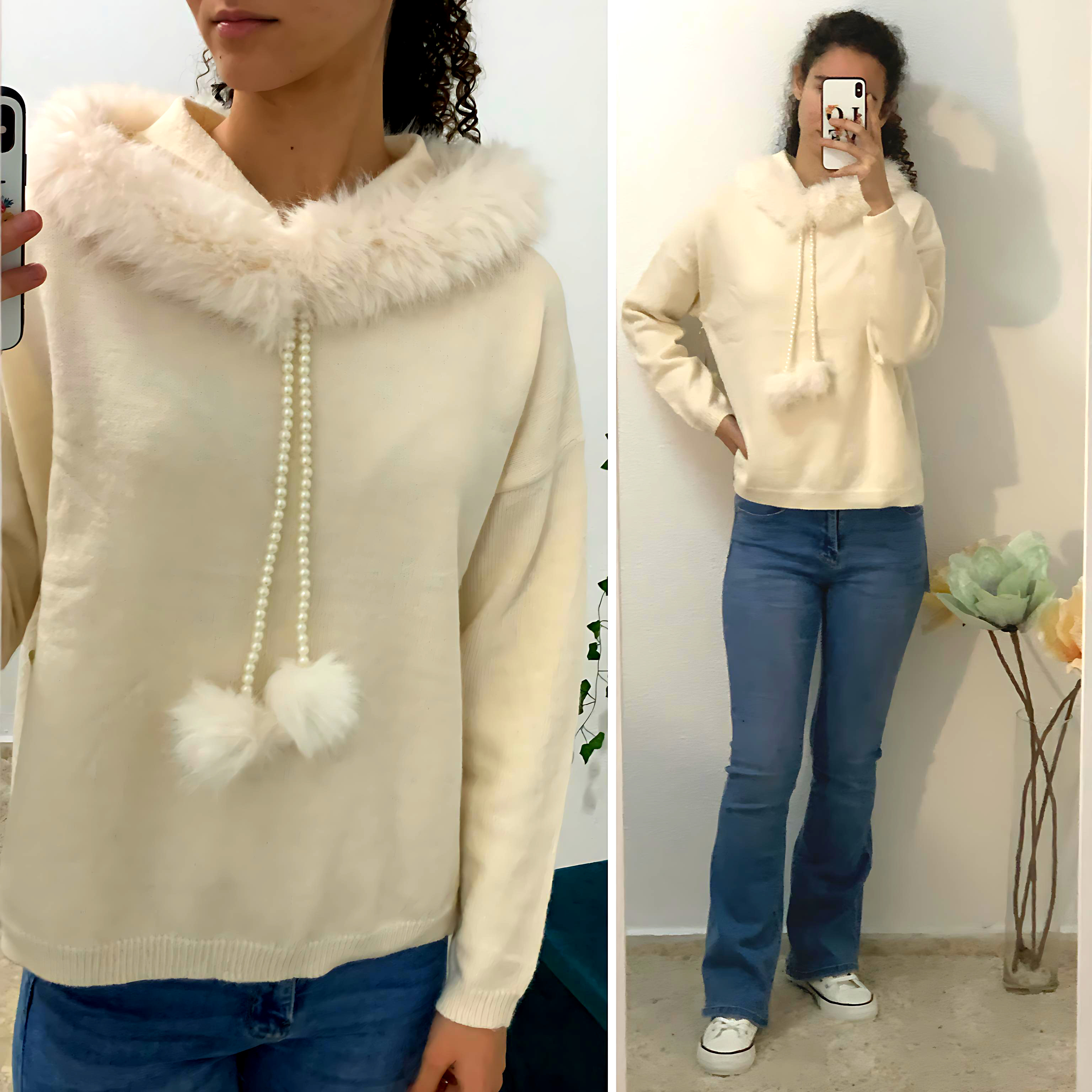 Jersey con capucha y cuello de pelo súper suave con cordones de perlas y pompones, todo desmontable. Talla única. Disponible en negro, camel y crudo.