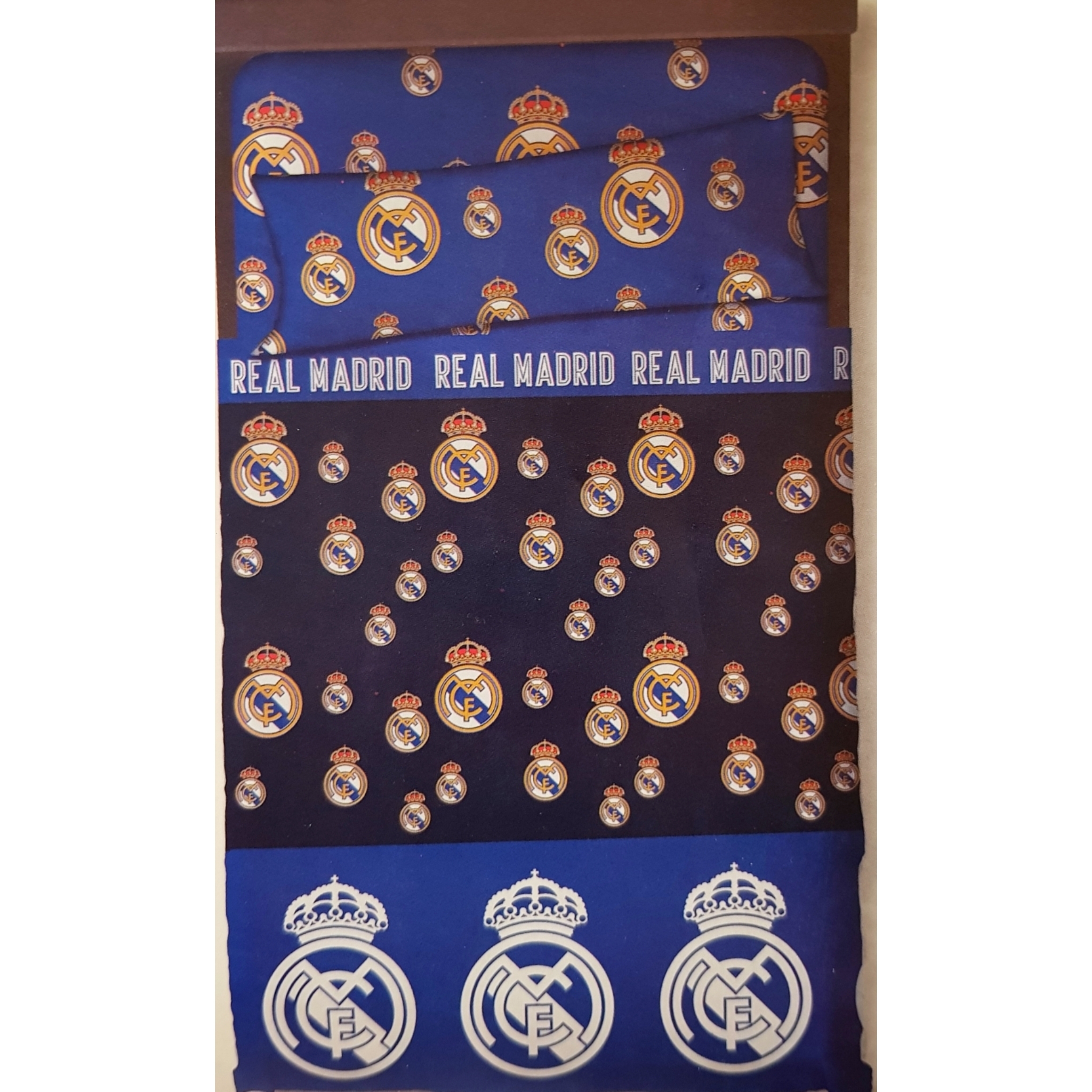 Juego de sábanas de invierno, coralina,del equipo de fútbol Real Madrid, compuesto por 3 piezas, cubre almohada, bajera y encimera. Medidas para cama de 90 cm, composición 100% poliéster.