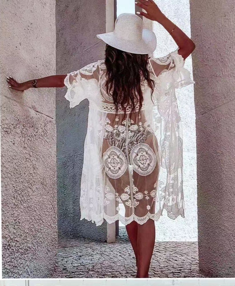 Kimono largo de media manga, bordado, parte delantera abierta con lazada para abrochar en el pecho. Disponible en blanco, verde, negro, rosa, celeste y beig, con diferentes bordados. Talla Única.