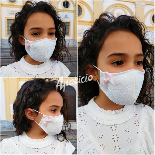 Mascarilla infantil con tejido brocado y filtro interior TNT. Disponible en dos tamaños. Ideal para comuniones o ceremonias.