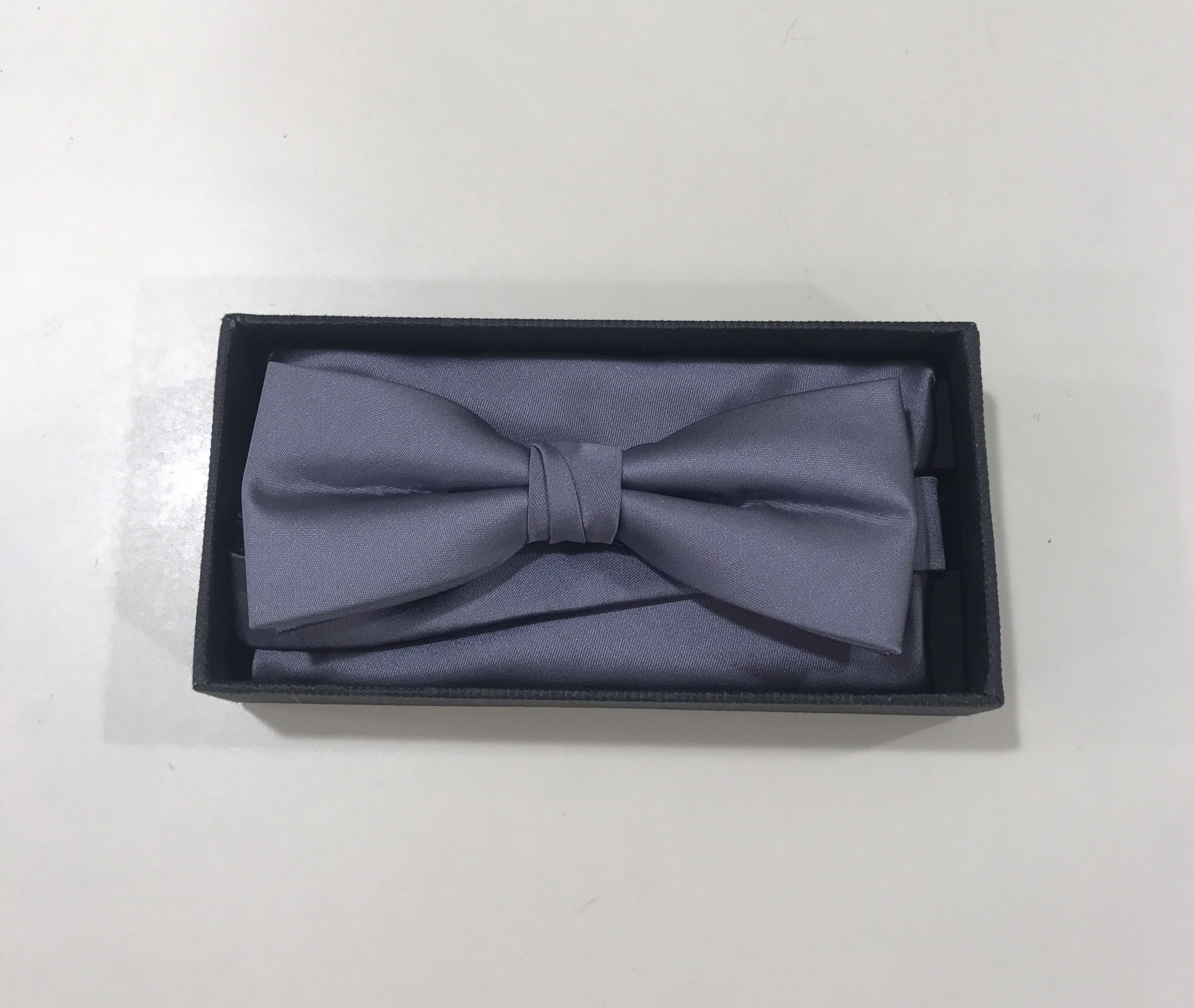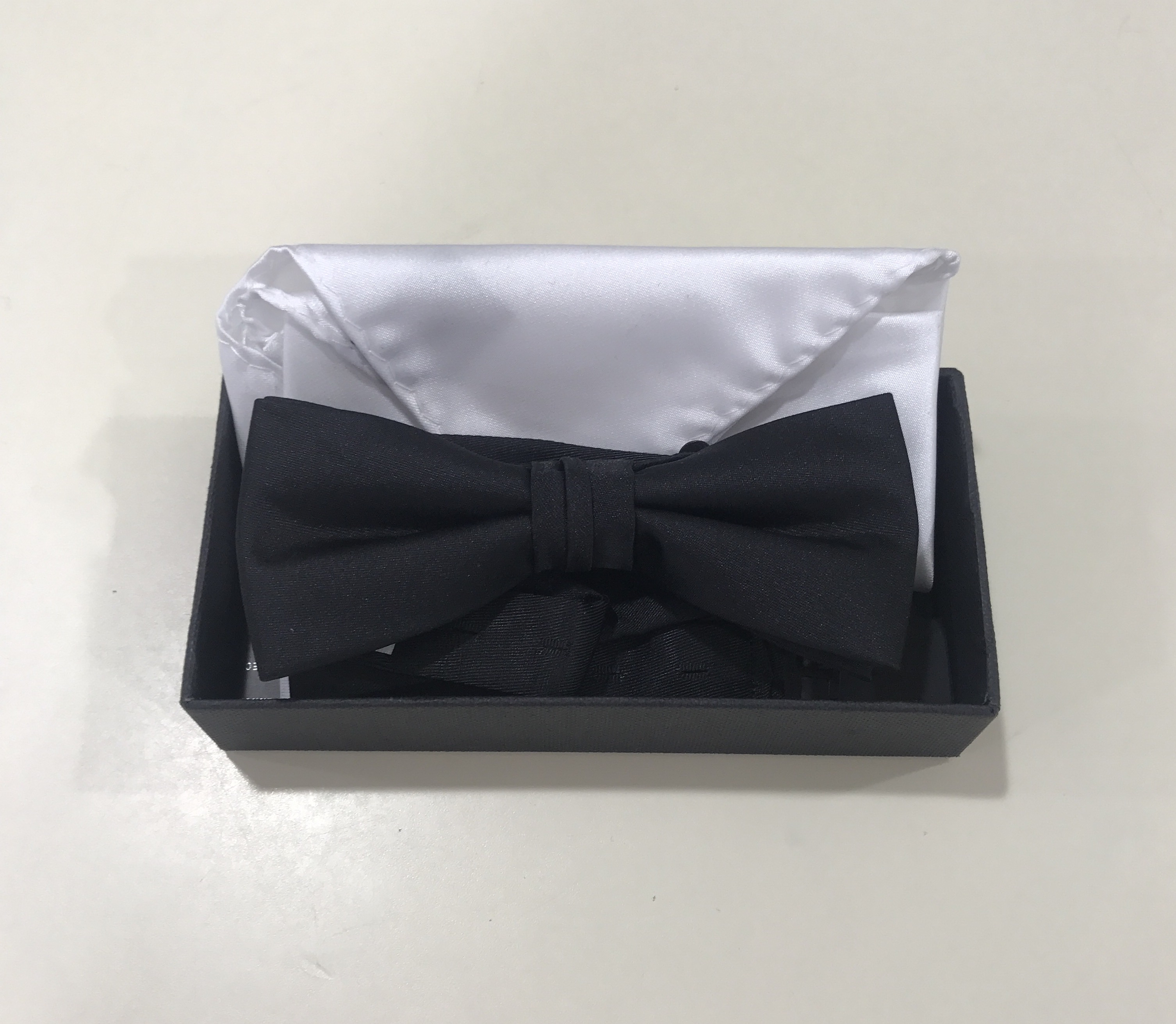 Pack compuesto por pajarita y pañuelo. Disponible en pajarita negra con pañuelo blanco, y pajarita con pañuelo gris.