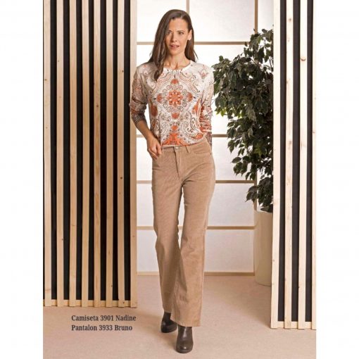 Pantalón de pana, con cierre de cremallera y botón, bolsillos traseros y laterales, para de campana, tiro medio alto. Se hace desde la talla 38 hasta la 52, en Camel y en blanco.