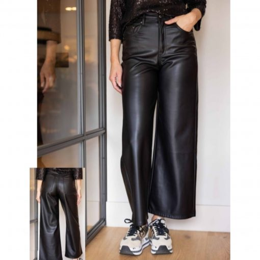 Pantalón tipo cullotte o croppet, de largo por encima del tobillo, acampanado, de tejido en polipiel, forrado por dentro con tejido aterciopelado, cierre de cremallera y un botón, presilla para cinturón y bolsillos. Se hace desde la talla 38 hasta la 48.