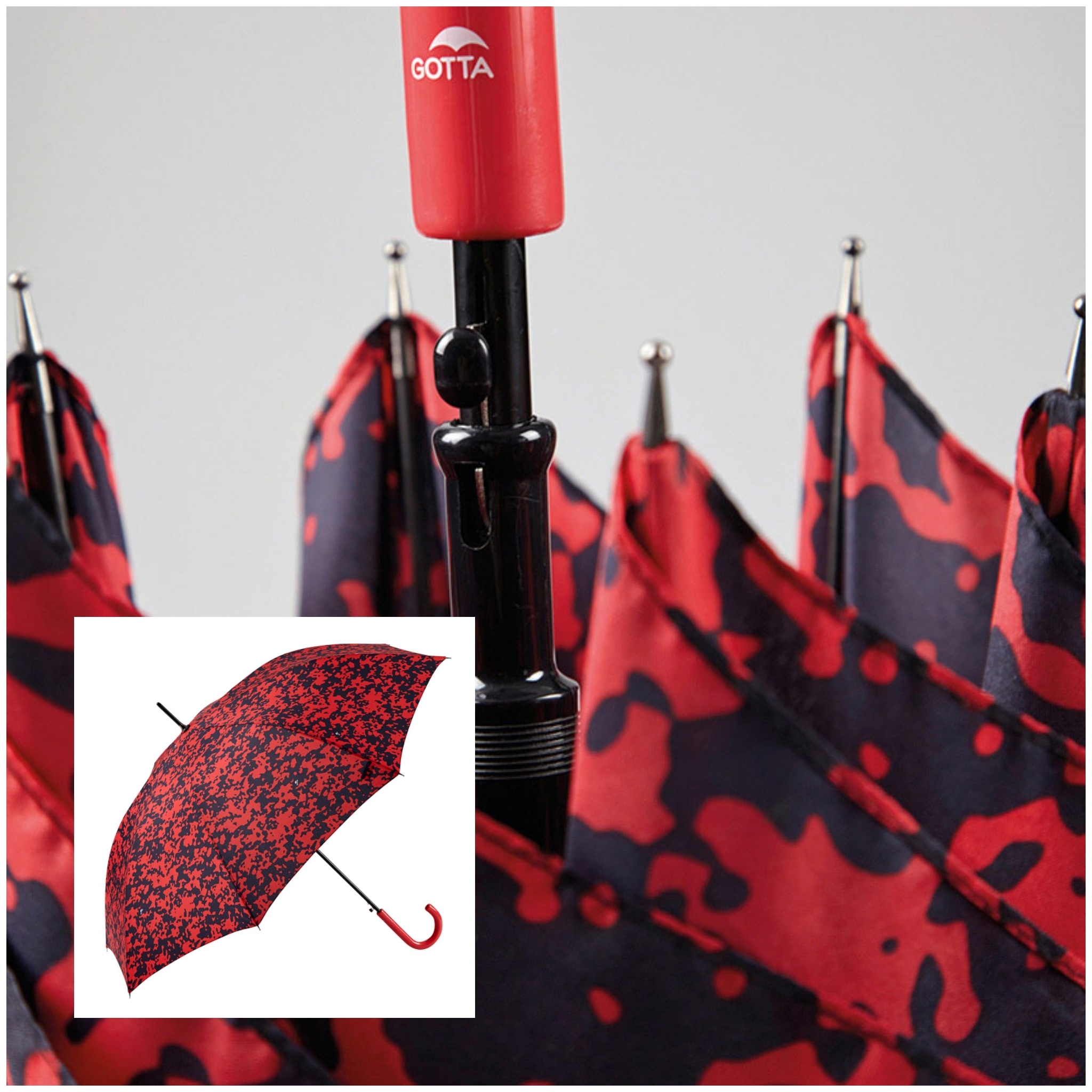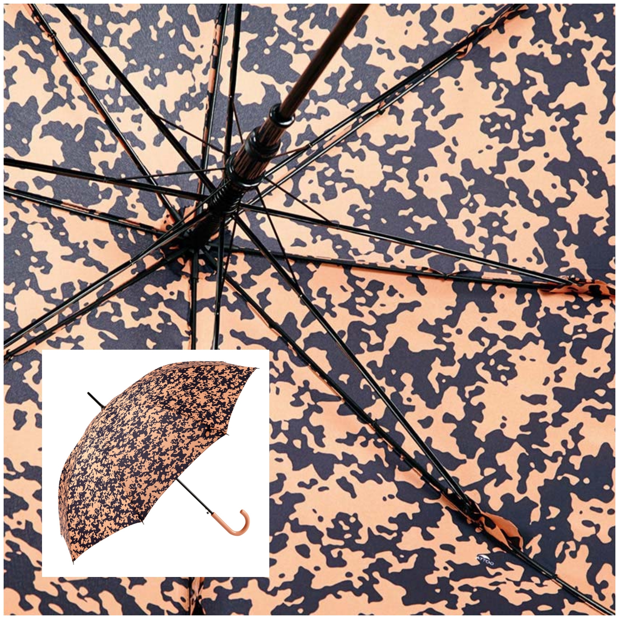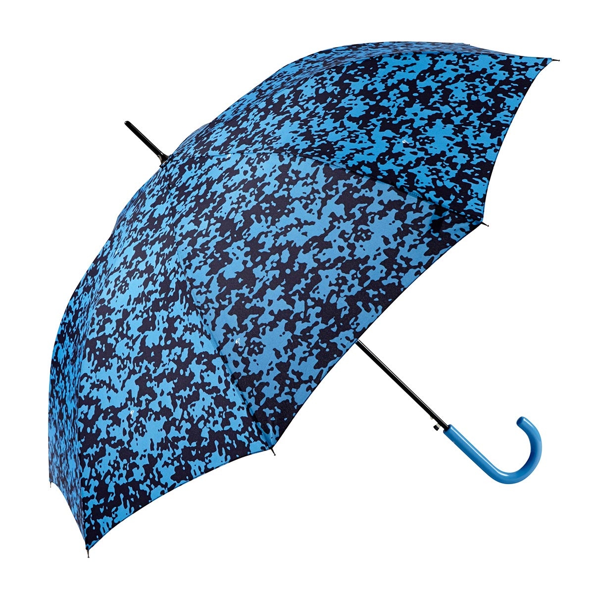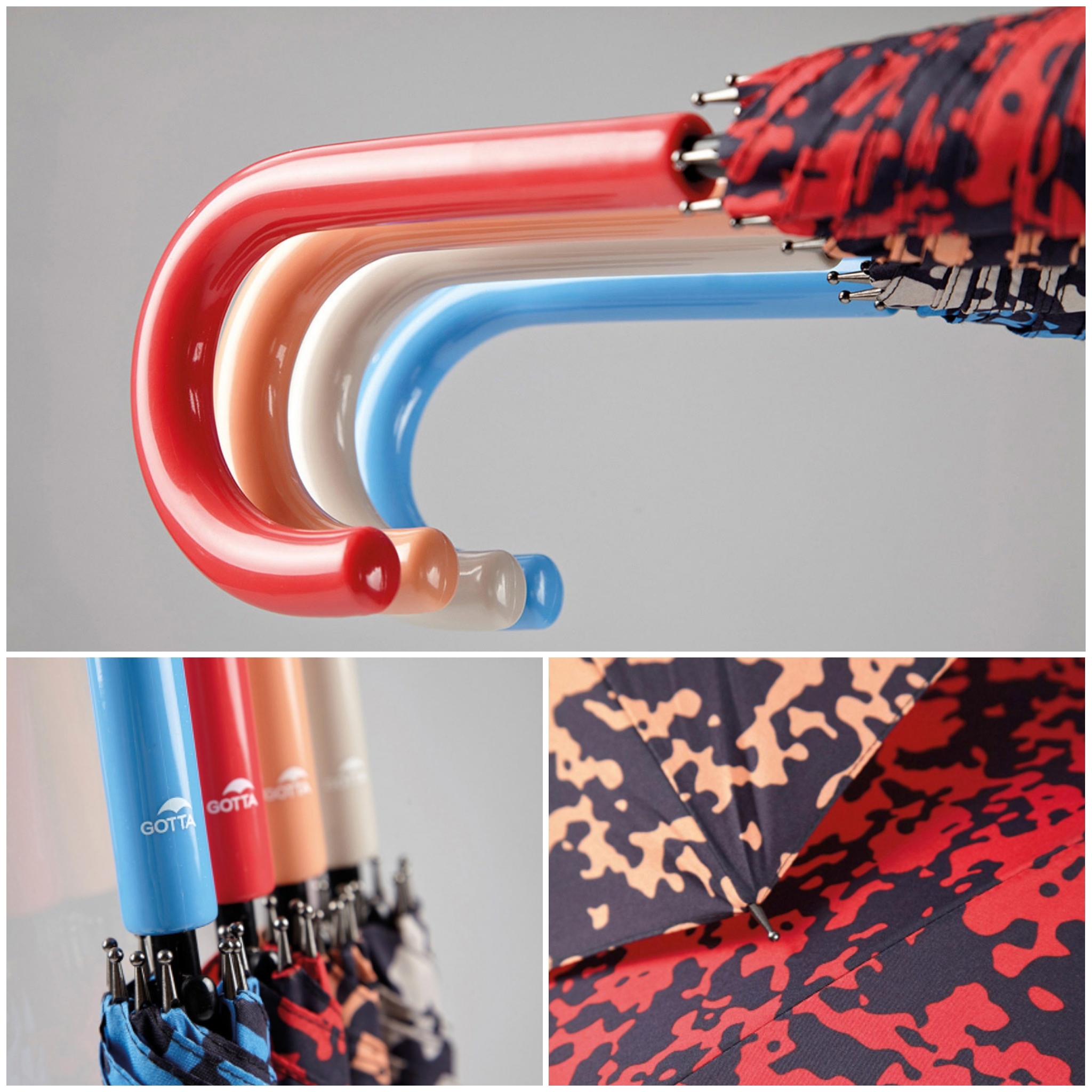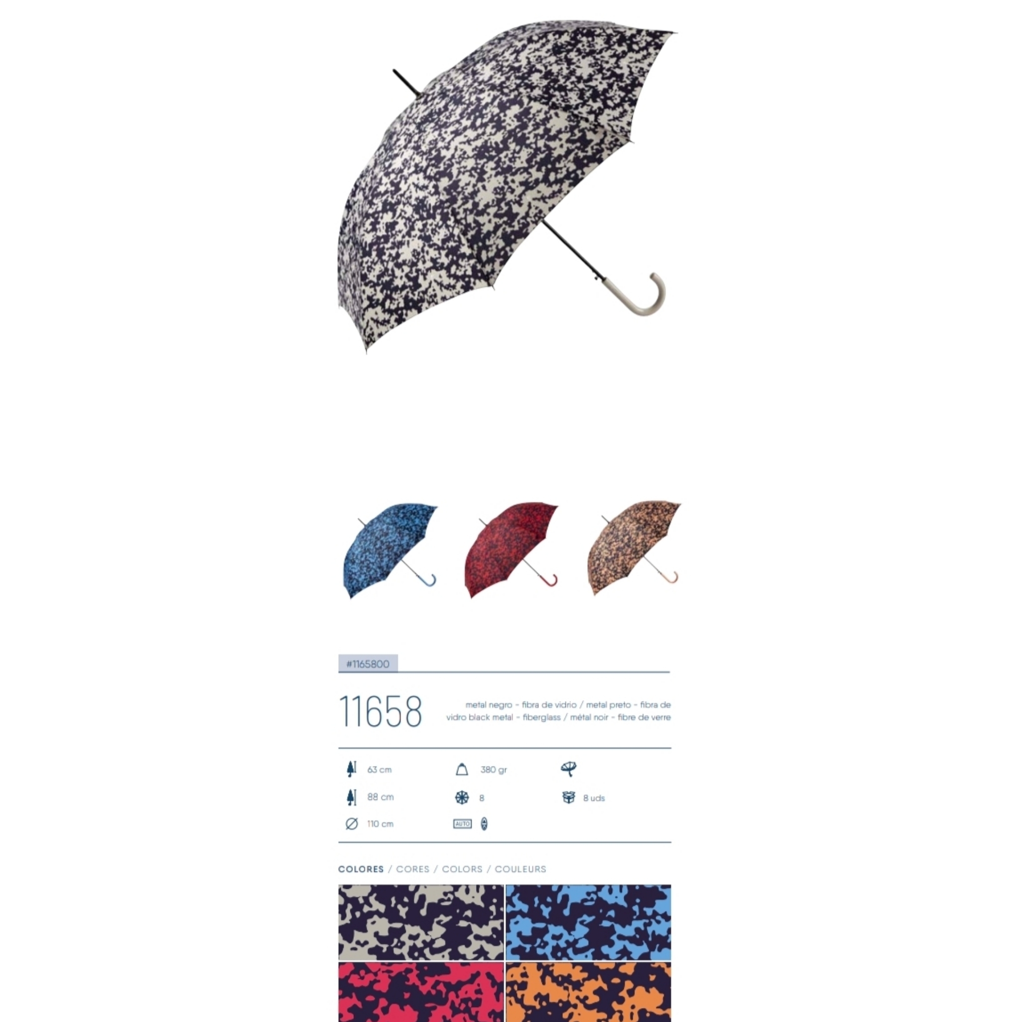 Paraguas con mango de colores, estampación de manchas, automático y antiviento. Tamaño adulto. Disponible en diferentes estampados.