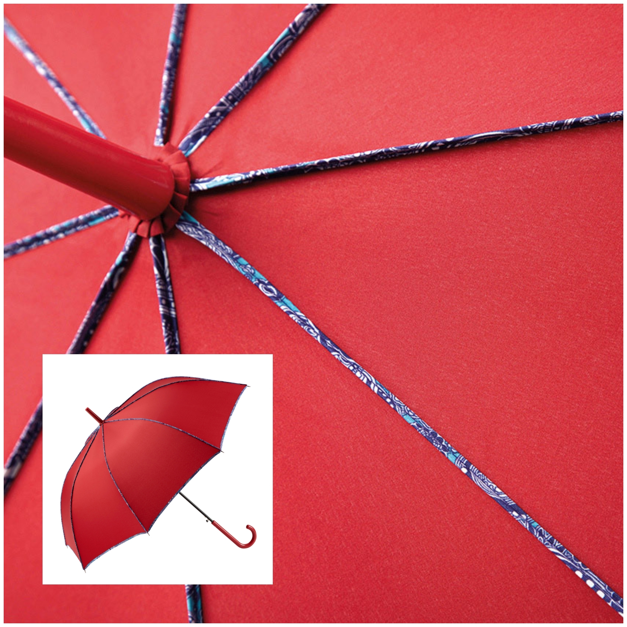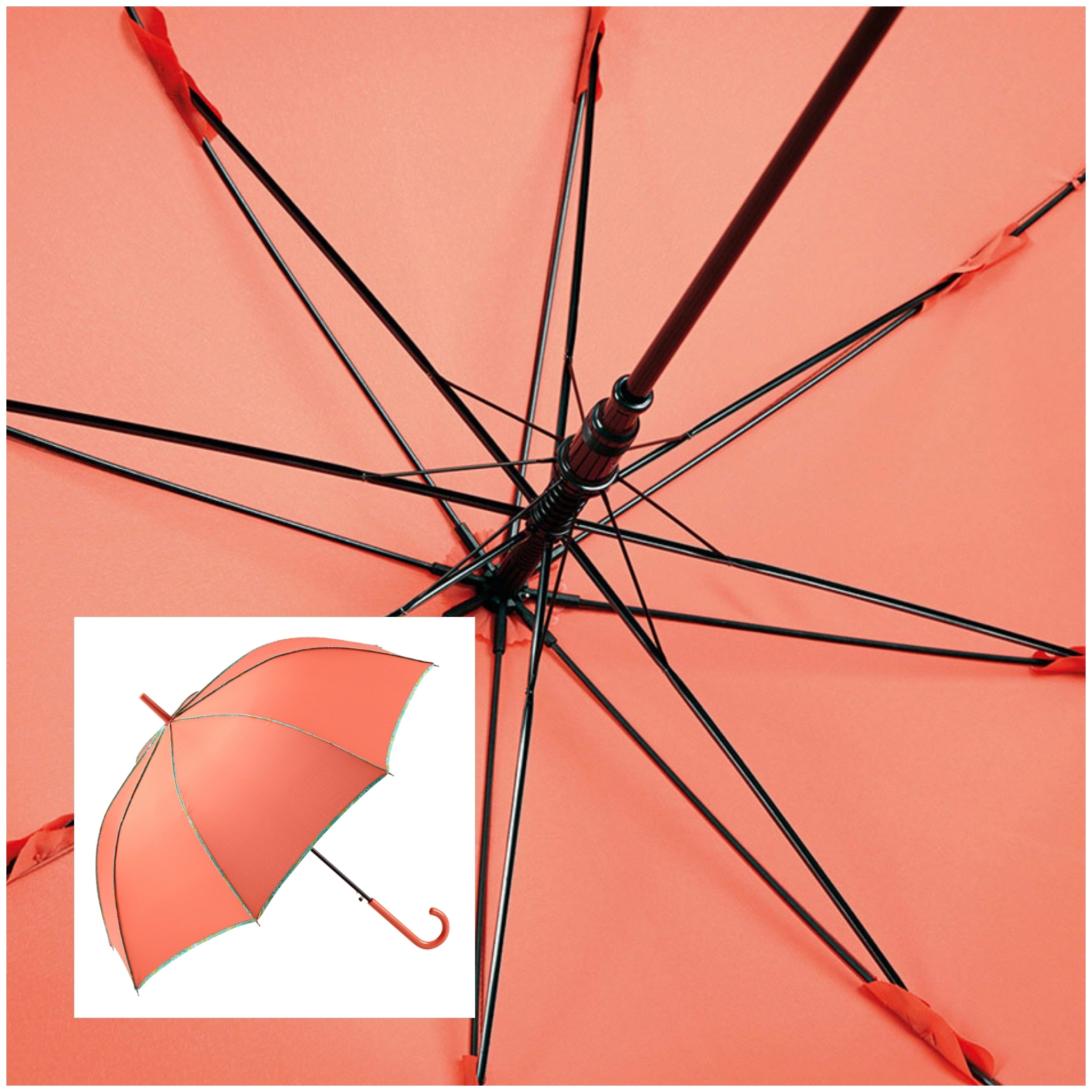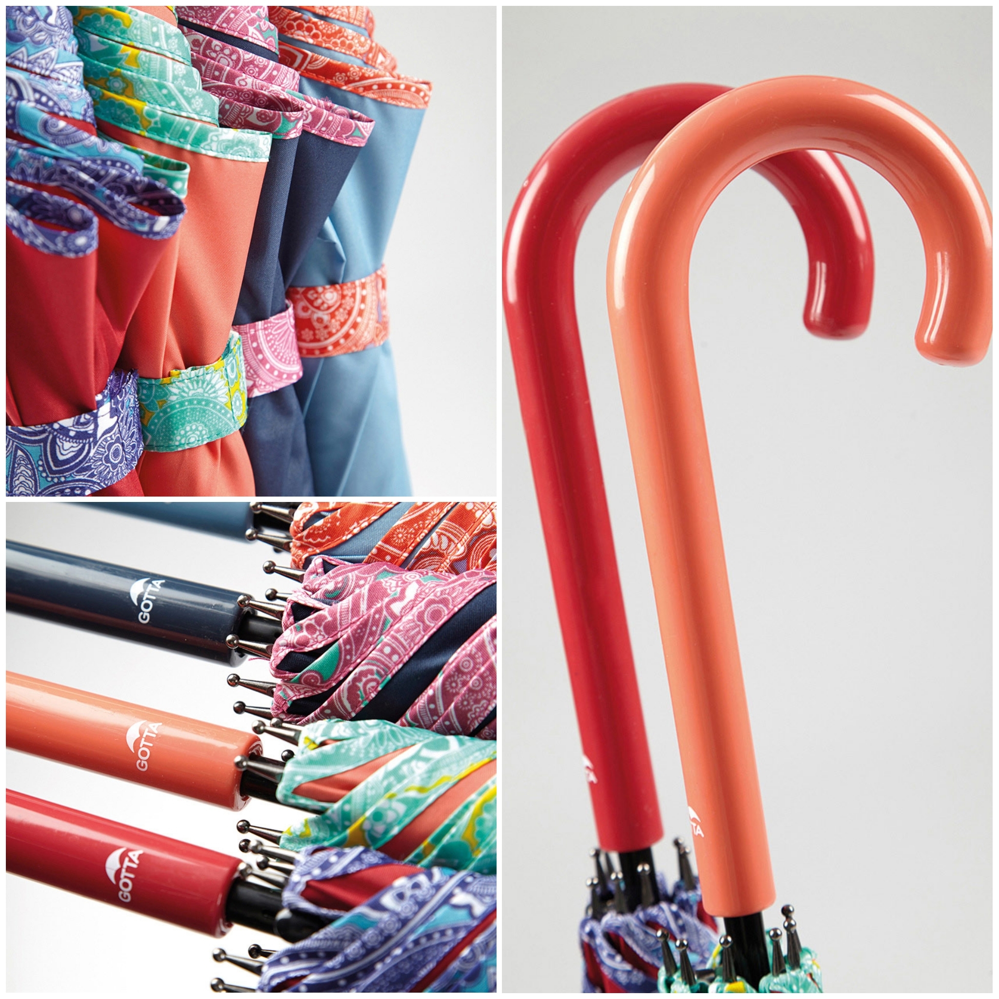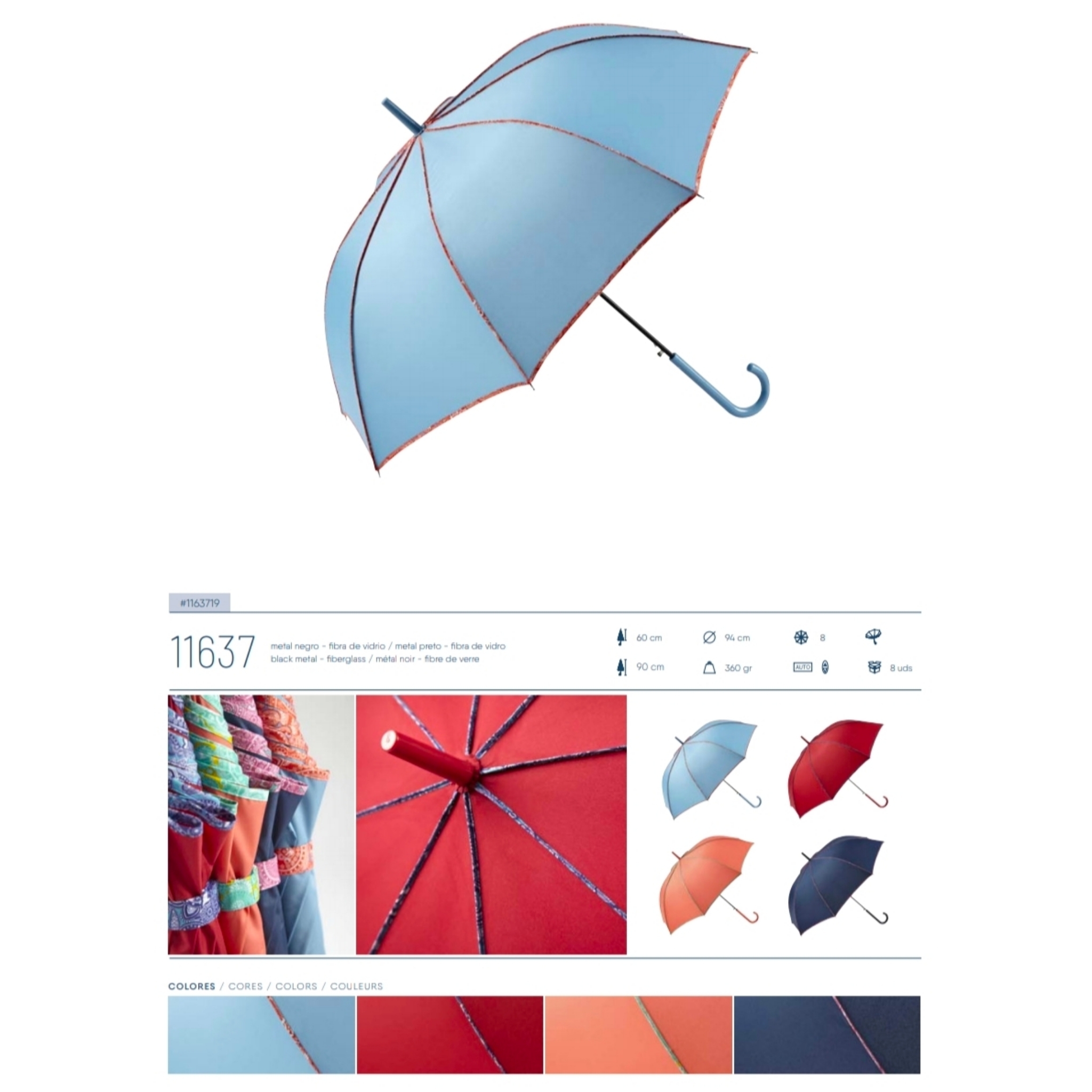 Paraguas liso con filos estampados, mango engomado en color liso, automático, y antiviento. Tamaño adulto.