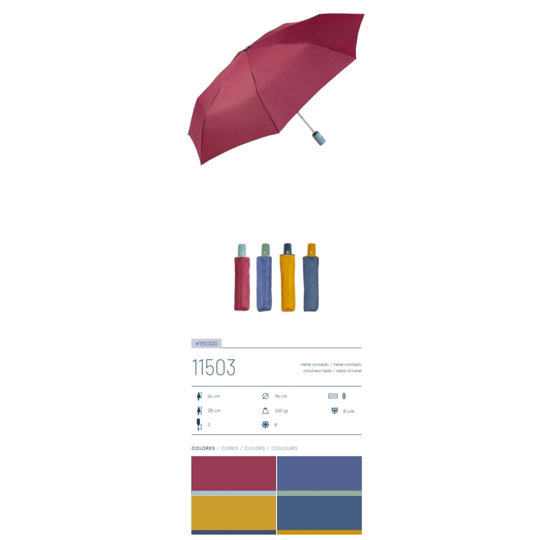 Paraguas, plegable, abre y cierra automático, de colores lisos con el mango de plástico. Disponible en diferentes colores, tamaño adulto.