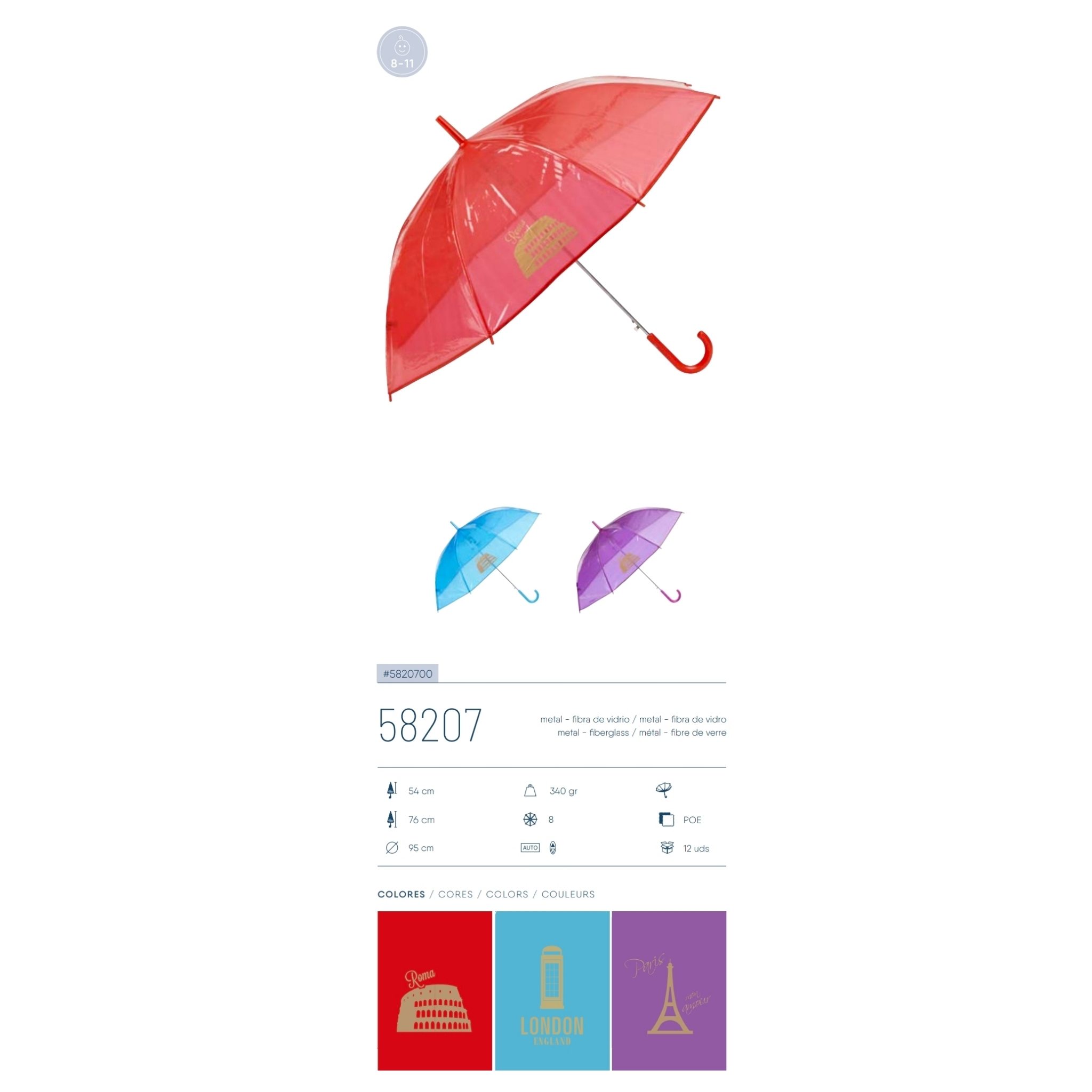 Paraguas infantil, de plástico, semitransparente, con mango. Disponible en diferentes colores, tamaño mediano.