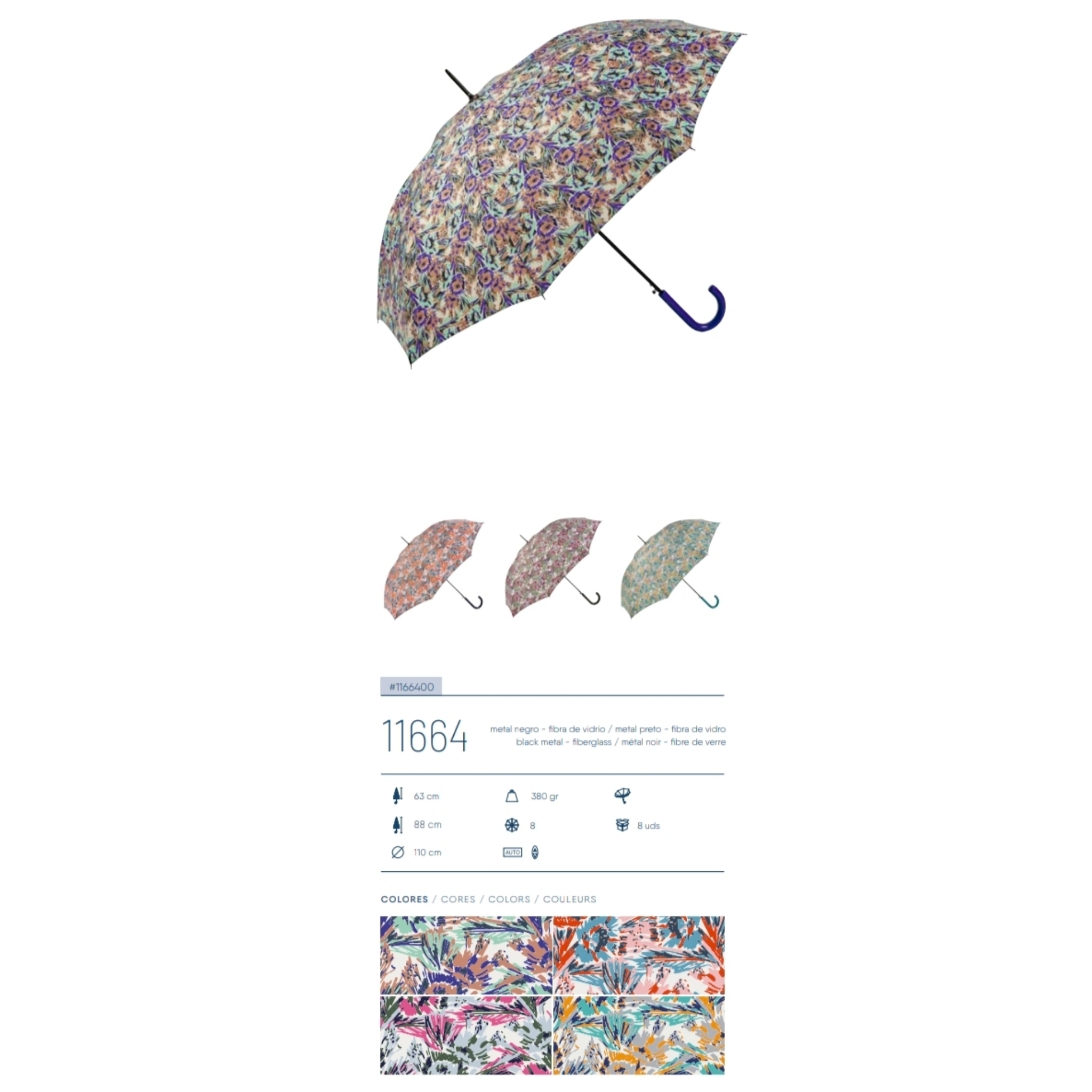 Paraguas con estampación, mango de plástico liso, antiviento, manual. Disponible en varios colores, tamaño adulto.