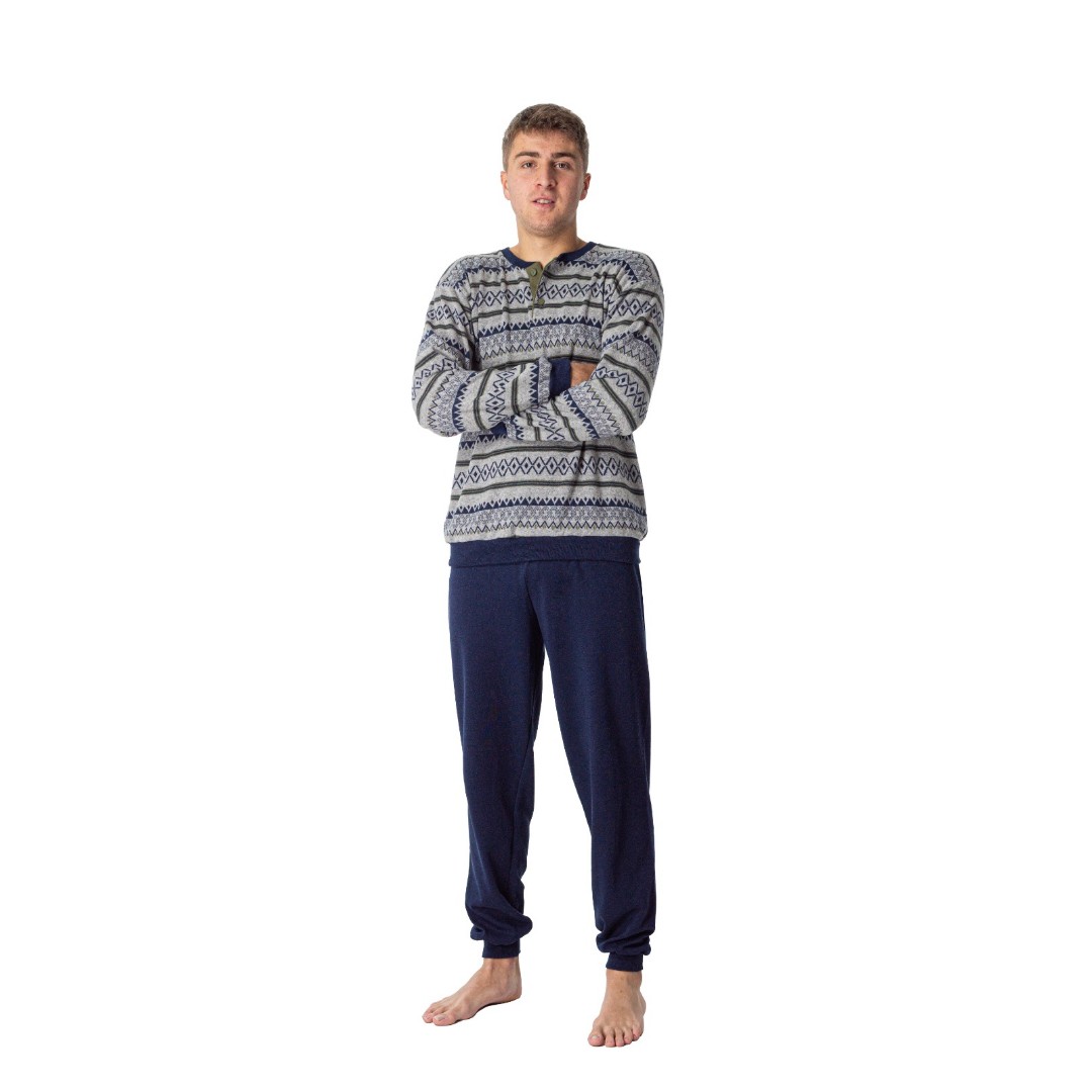 Pijama de hombre con camiseta fabricada en suave punto milano y pantalón en suave punto de algodón. Cálido y esponjoso afelpado interior y exterior. Cuello redondo con botones. Puño en muñecas y tobillos. Estampación de rombos y zigzag en tonos grises y azul marino sobre fondo gris vigoré. Fabricado en España. Alta calidad.