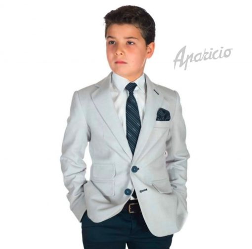 Traje de chaqueta de niño, compuesto por chaqueta gris, de cuello con solapas, cierre de dos botones en color azul marino, un bolsillo en el pecho y tres falsos bolsillos con solapas en la cintura. Pantalón liso azul marino con cierre de cremallera y un botón.