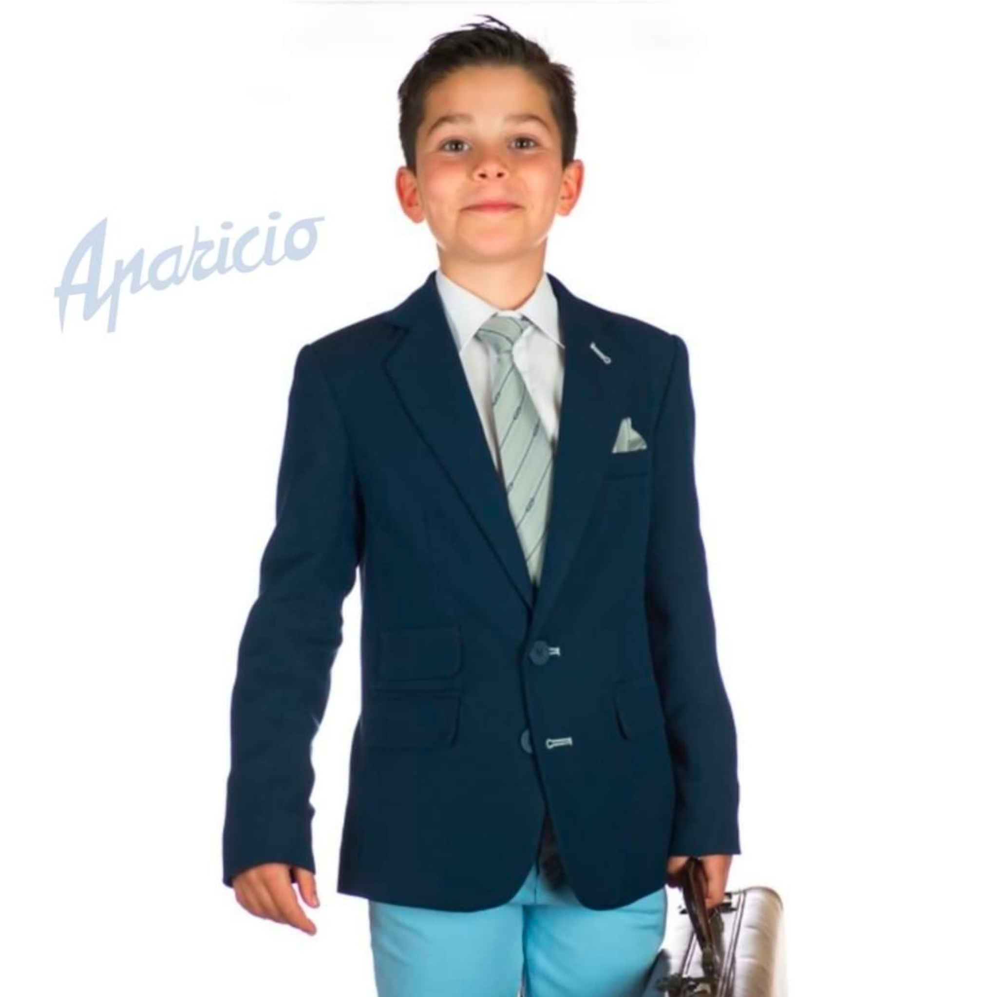 Traje de chaqueta de niño, compuesto por chaqueta azul marino, de cuello con solapas, cierre de dos botones, un bolsillo en el pecho y tres falsos bolsillos con solapas en la cintura. Pantalón celeste liso, con cierre de cremallera y un botón.