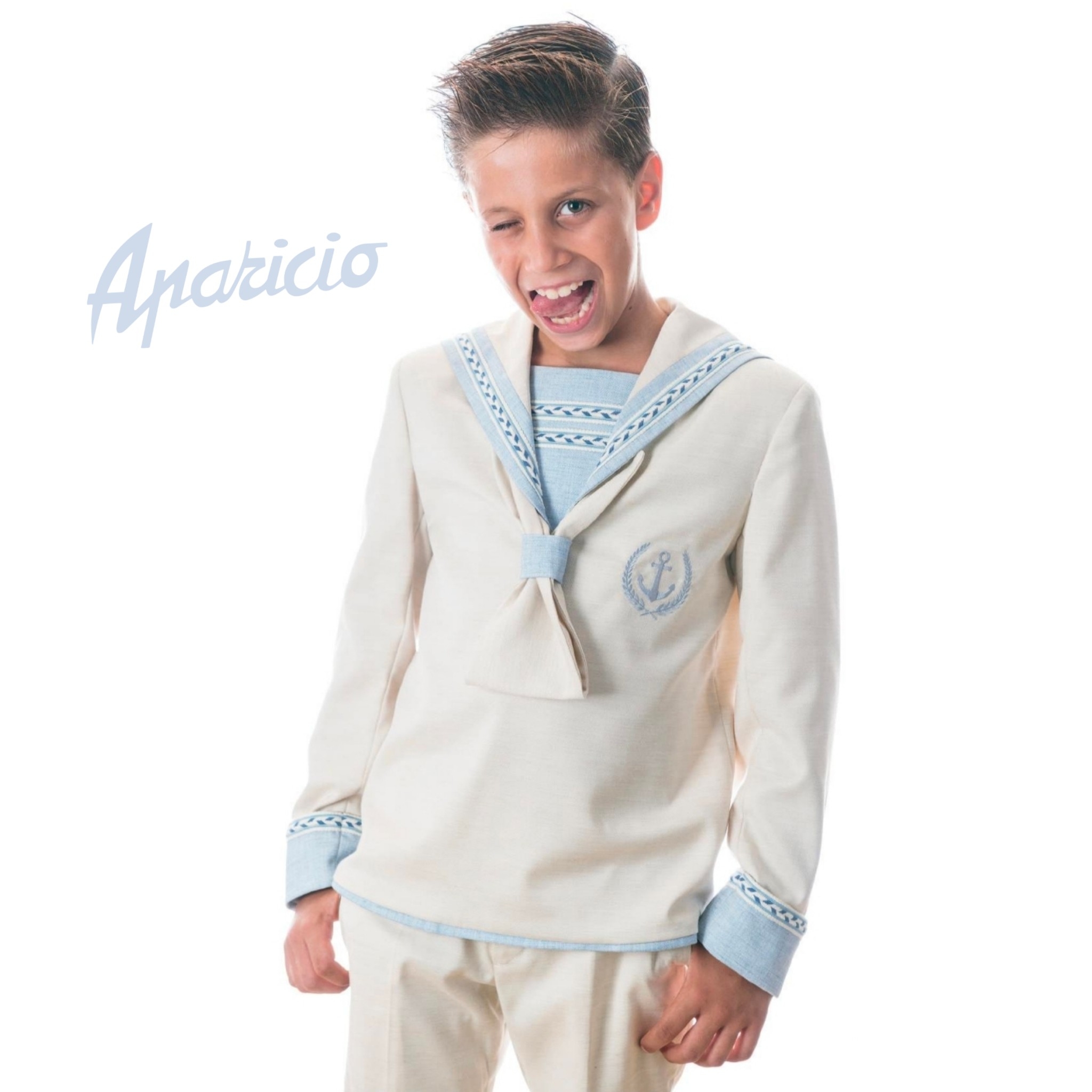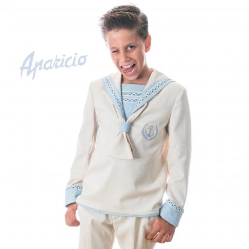Traje de comunión de niño, marinero, compuesto por parte de arriba en crudo, con vivos celeste, corbatín, y ancla bordado en el pecho. Pantalón liso con cierre de cremallera y un botón.