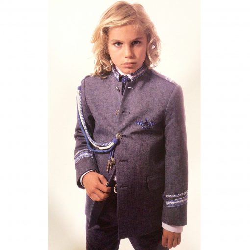 Traje de comunión, almirante para niño. Compuesto de chaqueta con cuello mao, vivos en azul marino y blanco en cuello, solapa de hombros y mangas. Pantalón liso con dos bolsillos y cierre de cremallera y botón.