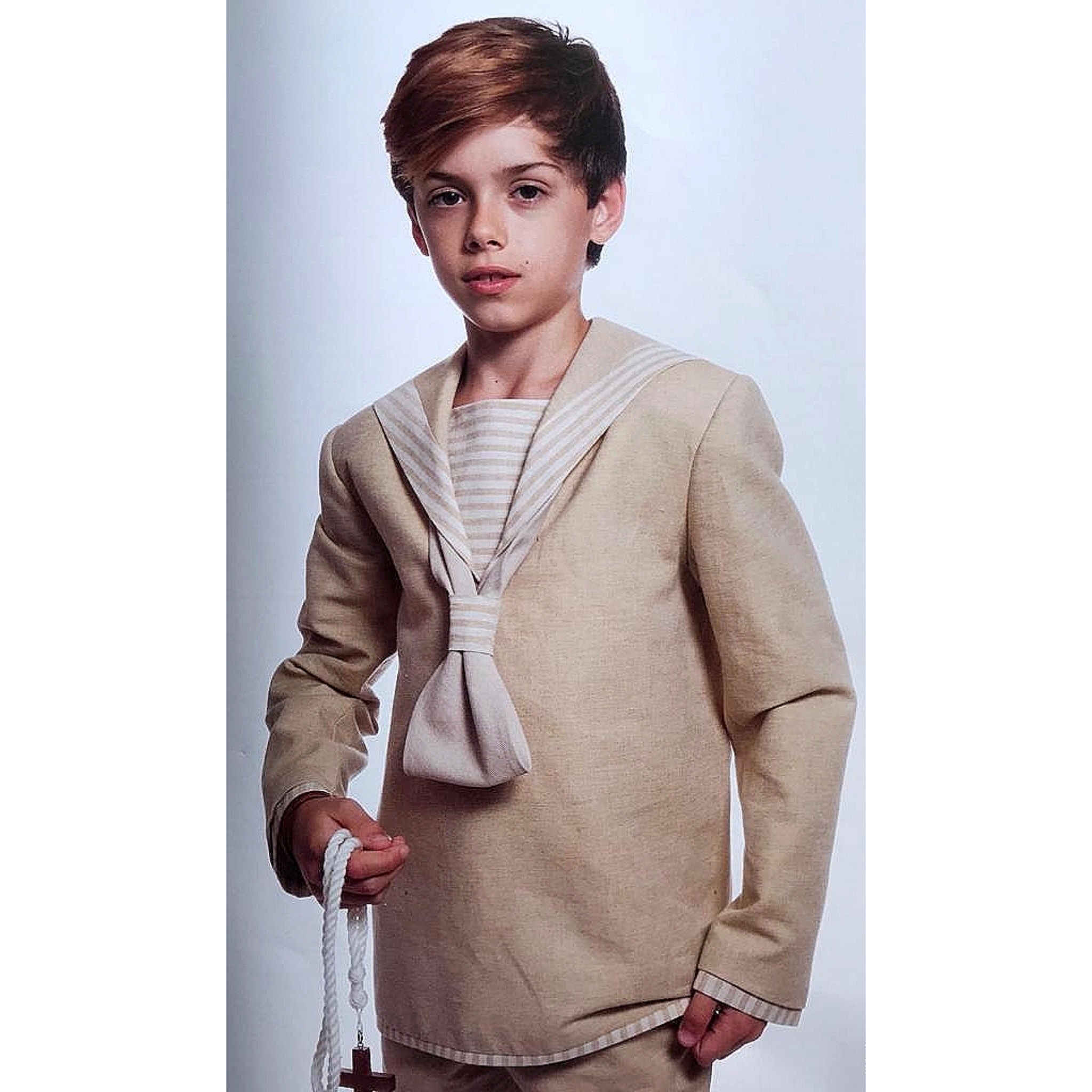 Traje de comunión de marinero, en color arena con vivos en el cuello, pecho y mangas. composición algodón y lino.