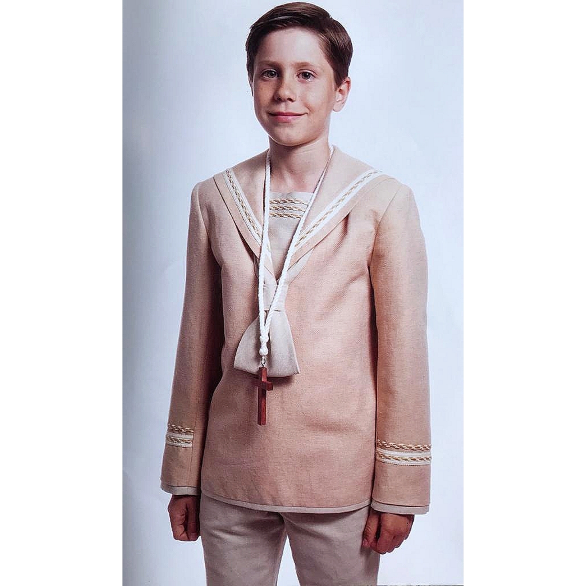 Traje de comunión de marinero, de algodón y lino, en color beig, con vivos blancos en cuello y mangas.