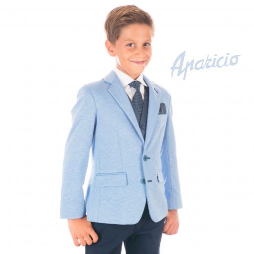 Traje de comunión de niño, compuesto por tres piezas, chaqueta celeste, con solapas, cierre de dos botones y bolsillos. chaleco con cierre de botones en color azul marino con lunares blancos y pantalón azul marino, con cierre de cremallera y un botón.