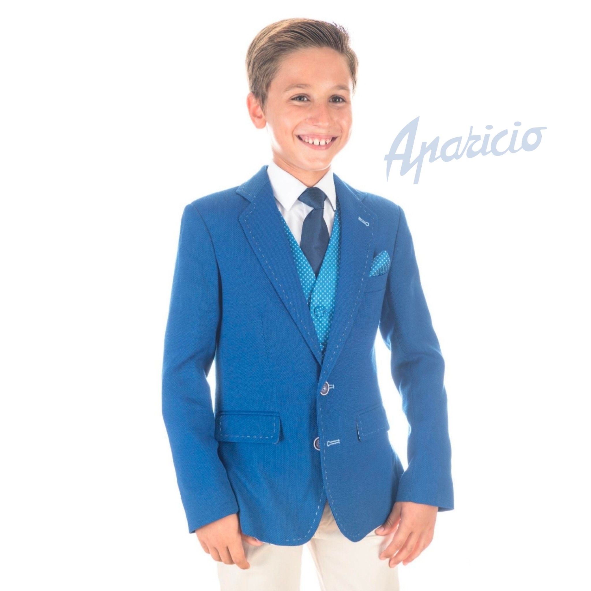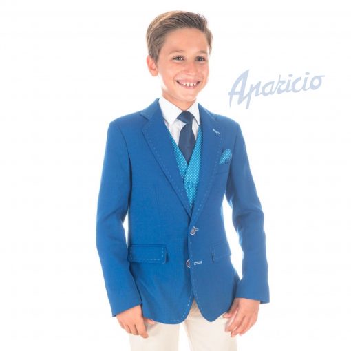 raje de comunión de niño, compuesto por tres piezas, chaqueta azulona, con solapas, cierre de dos botones y bolsillos. chaleco turquesa con lunares blancos, y pantalón blanco, con cierre de cremallera y un botón.