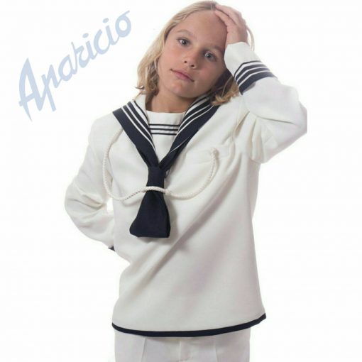 Traje de comunión de marinero para niño, compuesto de parte de arriba blanca con vivos en azul marino y pantalón blanco de pinzas en color liso.