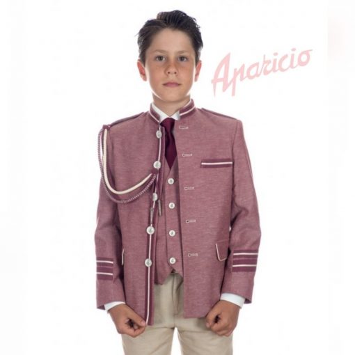 Traje de comunión compuesto por chaqueta de lino burdeos, con cuello mao, chaleco a juego con botones y pantalón también de lino en color beig.