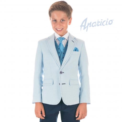 Traje de comunión de tres piezas, compuesto por chaqueta celeste, con solapa, bolsillo en el pecho, cierre de dos botones y bolsillos con solapas en la cintura. Chaleco turquesa con dibujos de anclas, y pantalón azulón, con cierre de cremallera y un botón.