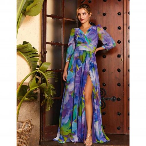 Vestido largo, estampado de cuello de pico cruzado, escote trasero en pico, mangas 3/4, sueltas. Incluye lazada para la cintura. Cierre de cremallera invisible lateral. Se hace desde la talla 38 hasta la 50.